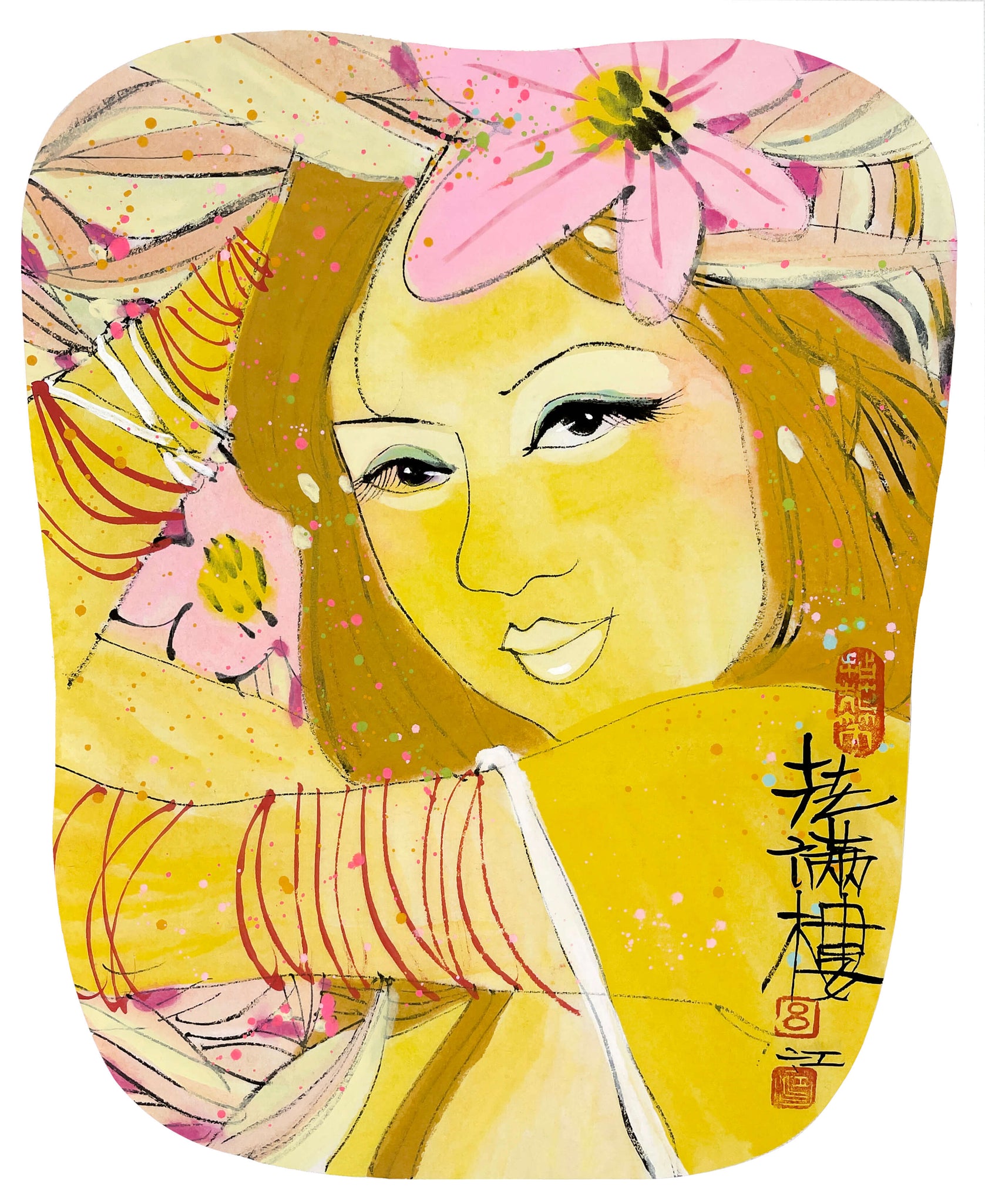 This expressive composition Title:d Flower House by contemporary Chinese artist Lv Jiang is rendered in ink and watercolor on paper, measuring 38 by 31 cm. Dominated by a sunlit palette of yellows and soft pinks, the work portrays a stylized female figure framed by floral motifs and organic patterns. The subject’s confident gaze and relaxed pose convey a sense of sensual allure, while the decorative flourishes and fluid ink lines emphasize elegance and spontaneity. The piece bears multiple seals and inscriptions, consistent with the artist’s blend of classical Chinese elements and contemporary themes.