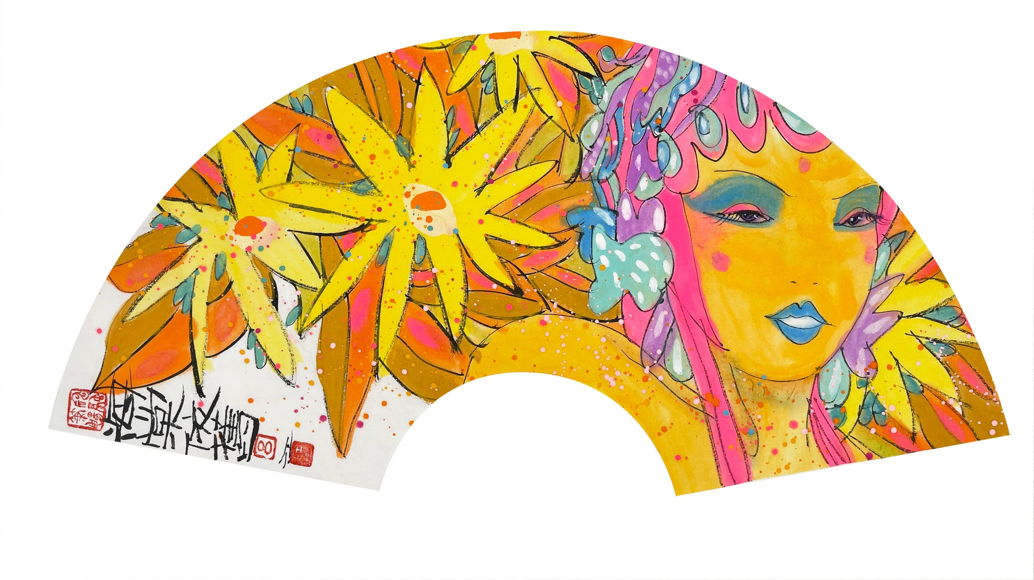 This vibrant fan-shaped composition by Lv Jiang presents a stylized female figure emerging amidst a profusion of radiant yellow begonia blossoms. Measuring 22 x 63 cm, the work’s unusual format enhances its theatrical and decorative qualities, recalling traditional Chinese fan paintings while adopting a bold contemporary palette. The figure’s serene expression, dramatic makeup, and intricate headpiece evoke themes of beauty and performance, typical of Lv Jiang’s oeuvre.