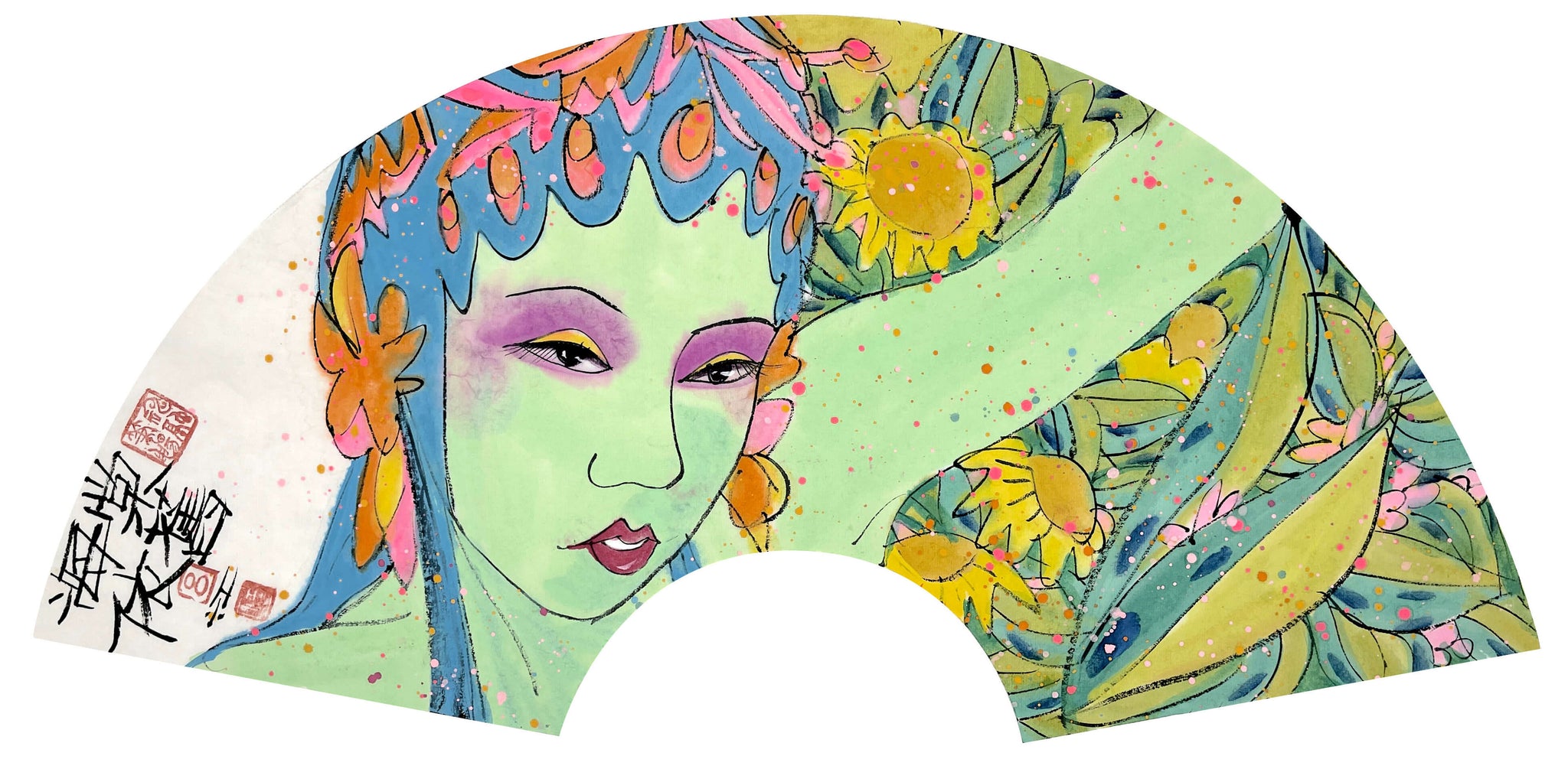 This vivid fan-shaped work by Lv Jiang features a stylized female portrait enveloped in lush botanical forms. Measuring 22 x 63 cm, the composition showcases the artist’s signature combination of expressive linework and exuberant color. The female figure, adorned with a headpiece and painted with theatrical makeup, gazes toward the viewer with poise, framed by blooming yellow flowers and layered foliage.