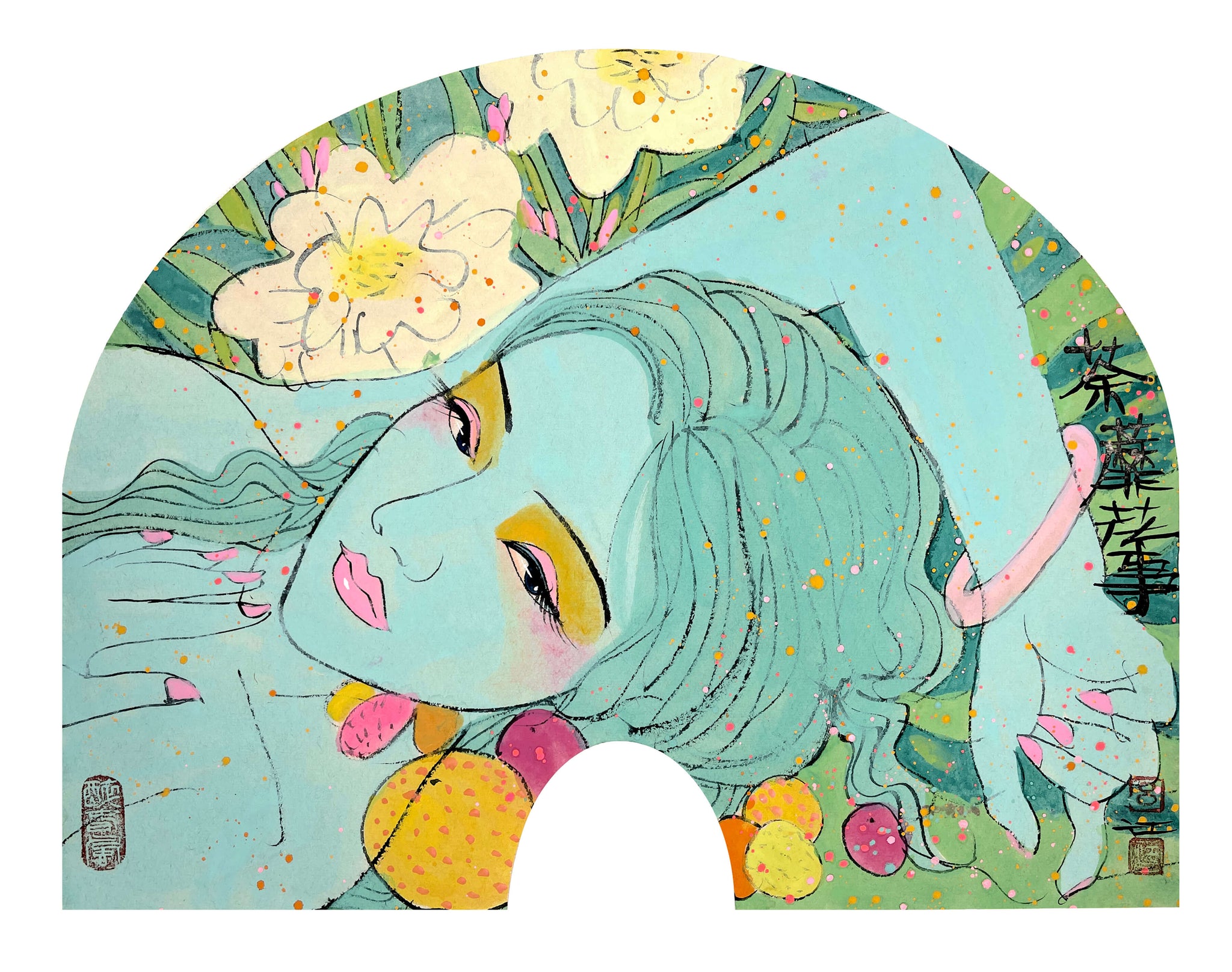 In Dream in Flower, Lv Jiang presents a dreamlike portrait of a reclining female figure nestled among softly blooming florals. Her seafoam blue skin tone, delicate gaze, and languid pose create an ethereal atmosphere, enhanced by the soft outlines and layers of watercolor washes. The semi-fan composition lends intimacy and a quiet rhythm to the piece, while the floral motifs suggest sensuality and renewal.