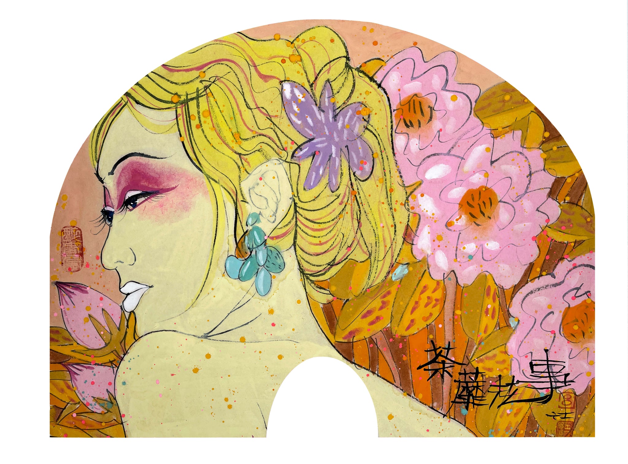 This vibrant composition captures a poised female figure in profile, her elegant features framed by cascading golden hair and delicate turquoise earrings. She is surrounded by lush pink blooms and ochre leaves, while a purple butterfly-shaped ornament graces her bun. The fan-shaped format enhances the intimacy of the subject, accentuating the harmony between human figure and floral elements.