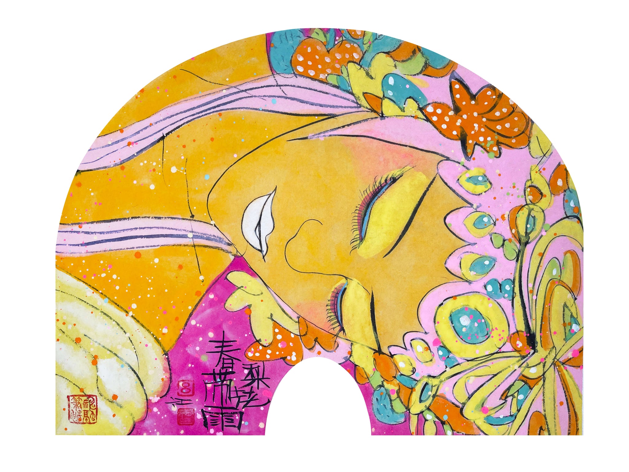 Dream in Flower presents an elegantly stylized female figure shown in serene repose, her eyes gently closed as she drifts amid a profusion of butterflies and floral motifs. Executed on a traditional fan‑shaped sheet, Lv Jiang layers translucent watercolor washes with deft ink outlines and controlled spatters of pigment, creating a luminous surface alive with pinks, oranges, and celadon greens. The arching format both frames and amplifies the dream‑like atmosphere that surrounds the reclining subject.