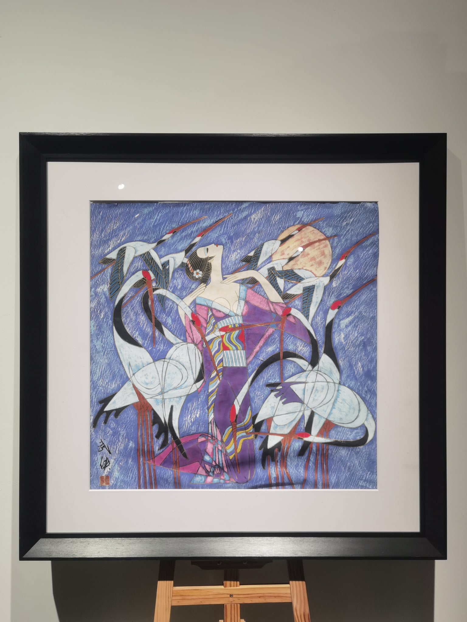 Character 2 is a vivid and stylized Chinese painting measuring 68 x 68 cm (26.77 x 26.77 in), executed in bold ink and color on paper. The composition centers on an elegant female figure adorned in radiant garments of pink, purple, and azure, surrounded by a harmonious flock of red-crowned cranes. Set against a dynamic cobalt blue background, the piece exudes theatricality and lyricism, with the moon rising behind the graceful scene.