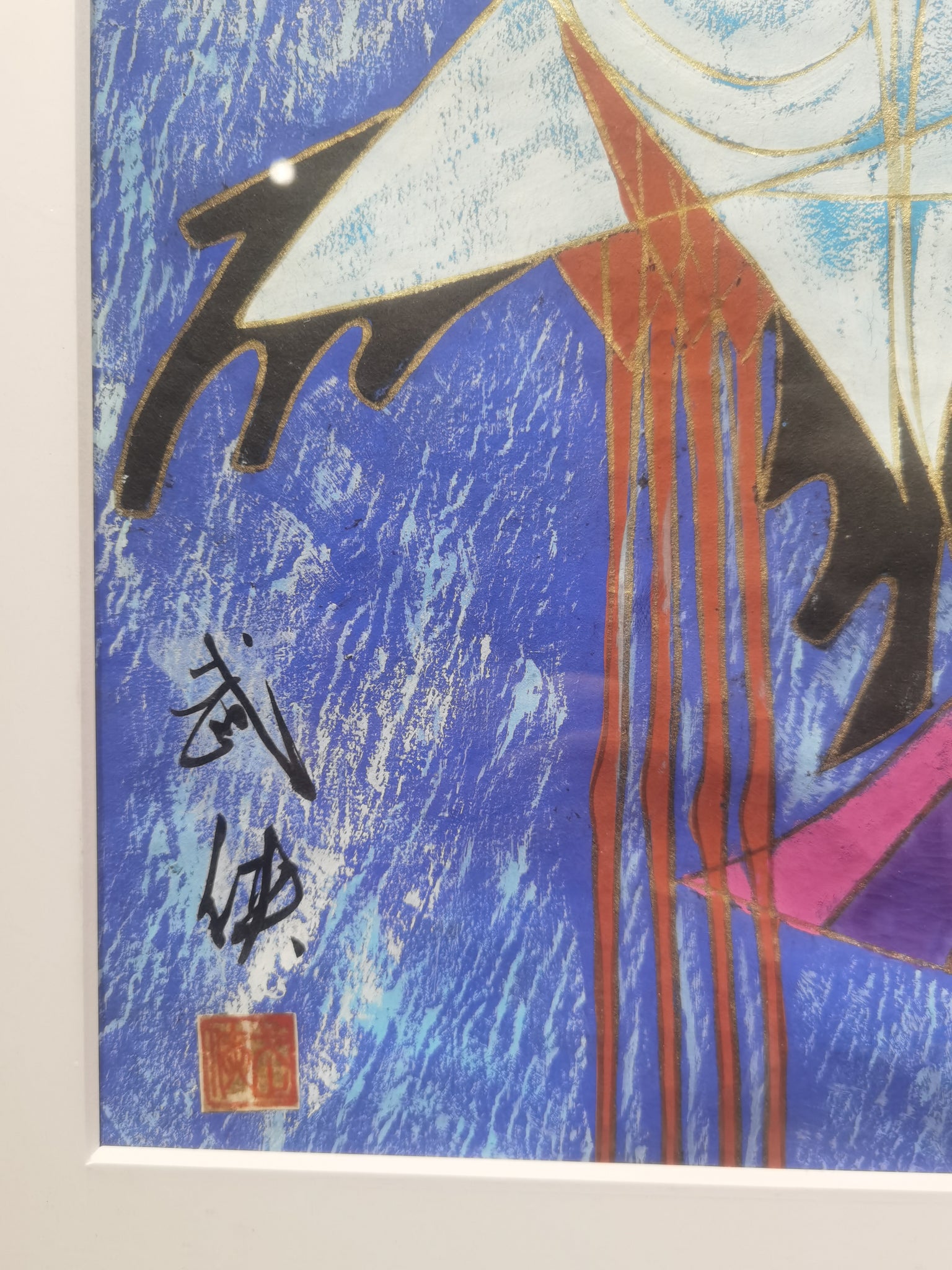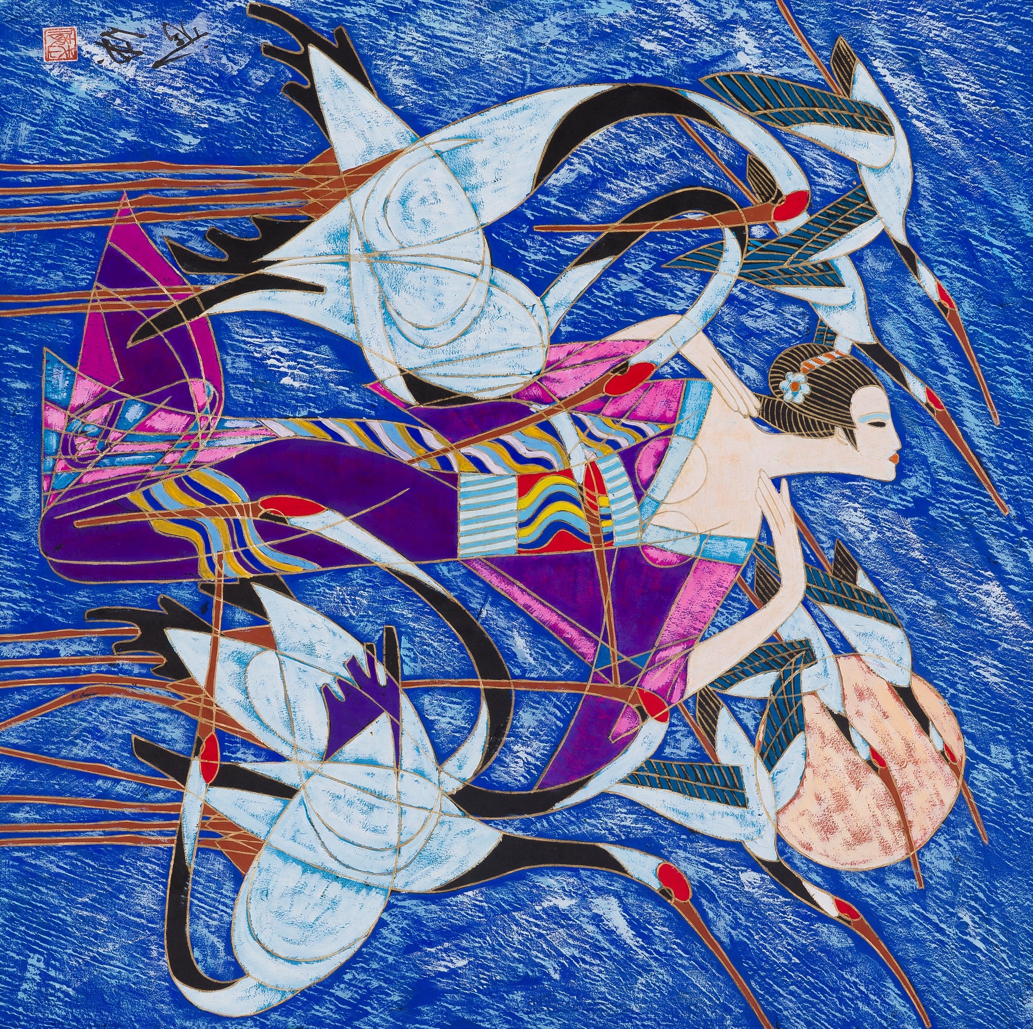 This work blends traditional Chinese symbolism with a distinctly modern aesthetic. The exaggerated curves, patterned robes, and flattened perspective evoke influences from Art Deco and Eastern folk art. The stylized treatment of the cranes—with their elongated necks and expressive beaks—resonates with the decorative abstraction often seen in modern Chinese figure painting. Shaoguang's palette and linework also suggest a contemporary feminist voice, using classic motifs to frame themes of beauty, strength, and mythic femininity.