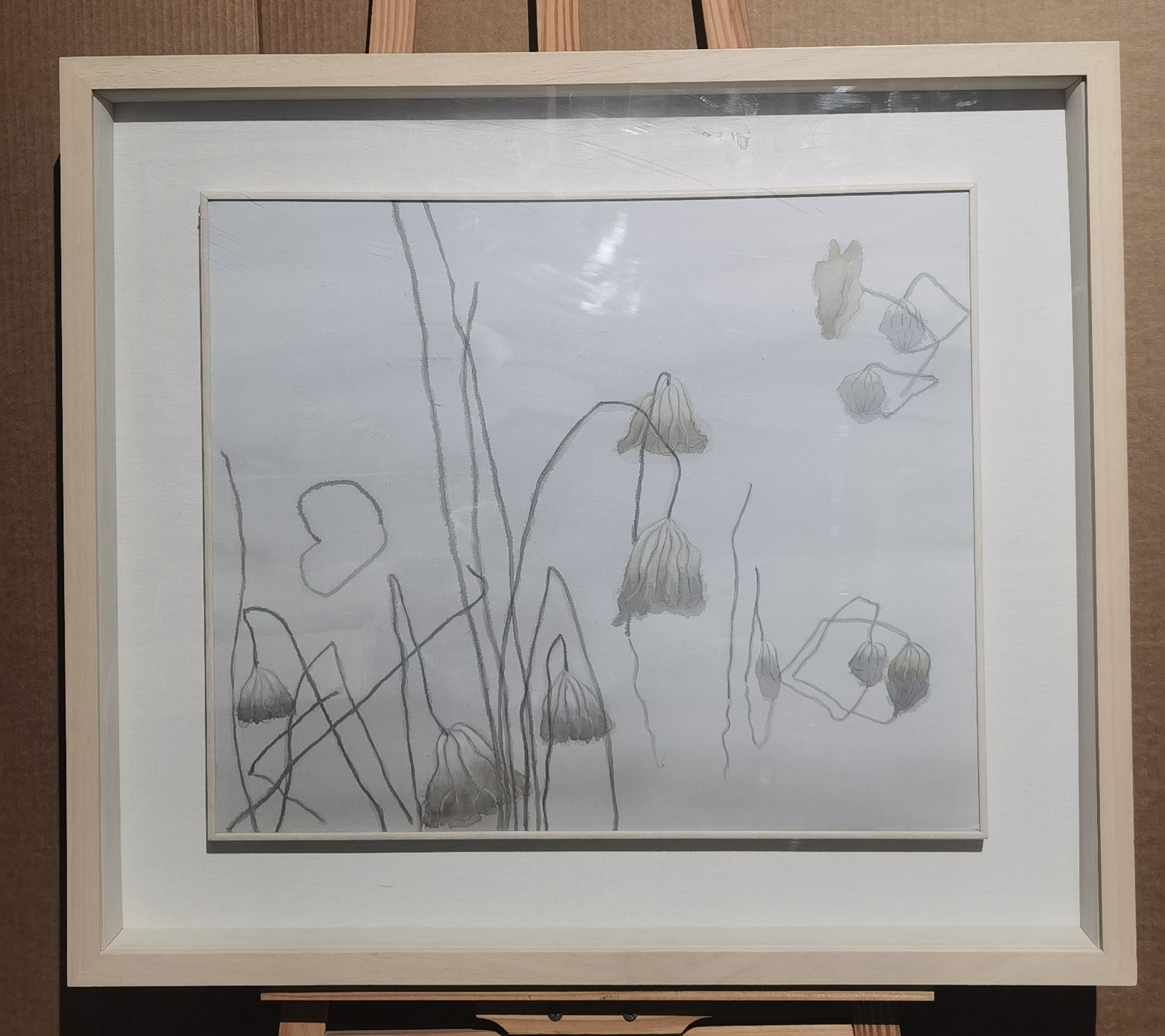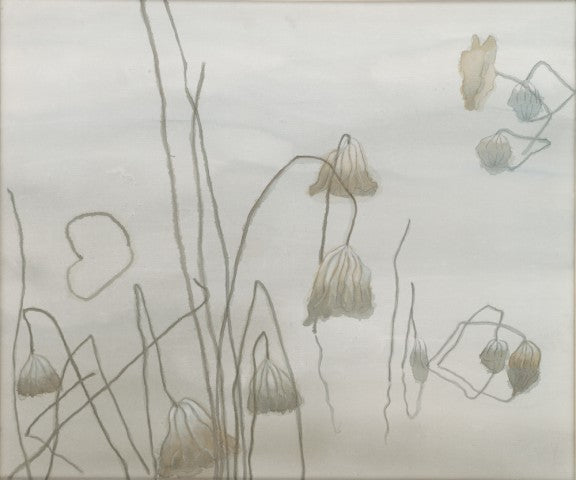 The Days Are Cold and Deep by Ping Tang is a contemplative work rendered on canvas, measuring 50 by 60 centimeters. The composition depicts desiccated lotus or water lily stems and fading blossoms, their skeletal forms elegantly articulated through delicate lines and subdued tonalities. The restrained palette and fragile contours evoke a poetic meditation on impermanence.