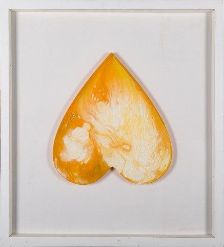 Heart Talk Series No. 2 by Yu Zheng is a mixed media piece measuring 70 by 70 cm. The painting prominently features a heart shape rendered in swirling shades of yellow and orange. Within the heart, there is a delicate, almost ethereal figure of a girl, centrally positioned, blending into the abstract forms and colors around her. The work is notable for its dynamic patterns and emotive use of warm tones.