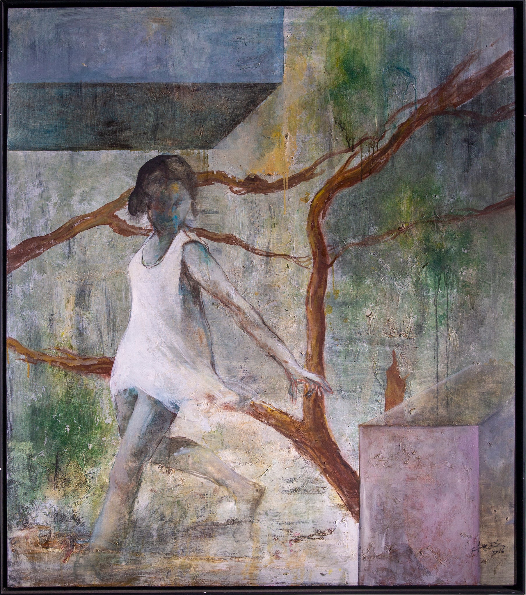 An Inner Monologue in Fantasy (2016) by Chengzheng Zhang is a large mixed media painting featuring a young girl in a white dress captured in graceful motion. Positioned behind her is a tree, while two rectangular cubes appear in the upper left and lower right corners of the composition. The overall image is marked by a characteristic blurriness and softness, evoking a dreamlike or introspective mood. The layering and mixed media technique create rich textures and depth throughout the canvas.