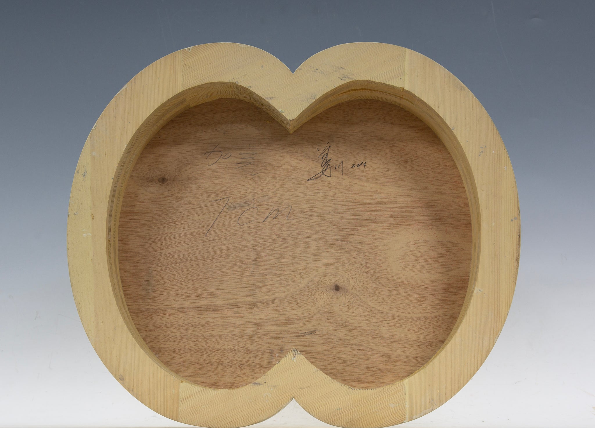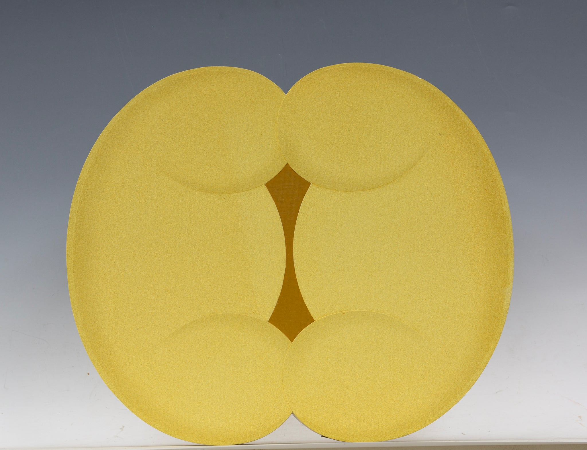 Grease (2014) is a compelling circular composition by Chinese contemporary artist Jiang Chuan, rendered in mixed media on a 45 cm diameter surface. The piece features an abstracted, biomorphic form in radiant shades of yellow, bisected by subtle negative space that evokes a meditative symmetry. Both sculptural and painterly in effect, the work balances sensual curvature with conceptual restraint.