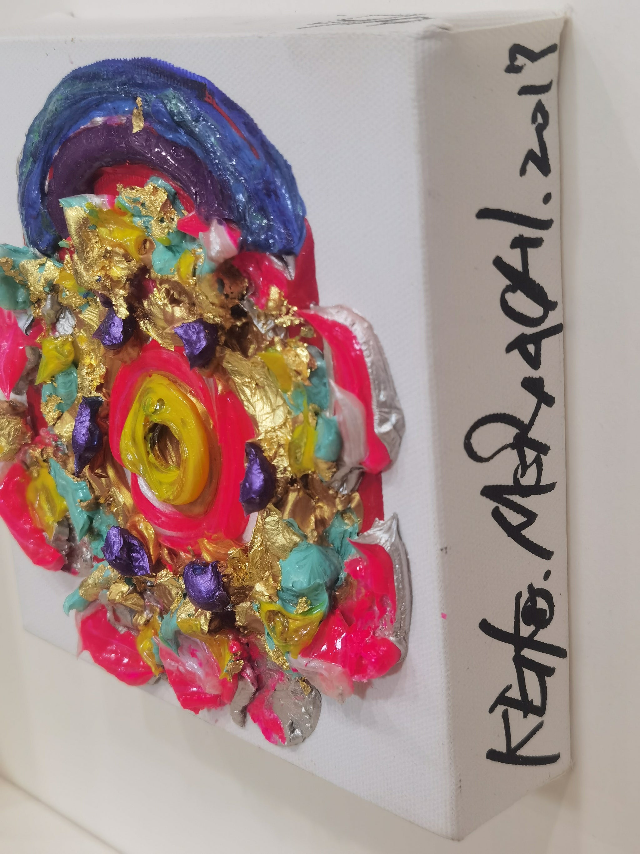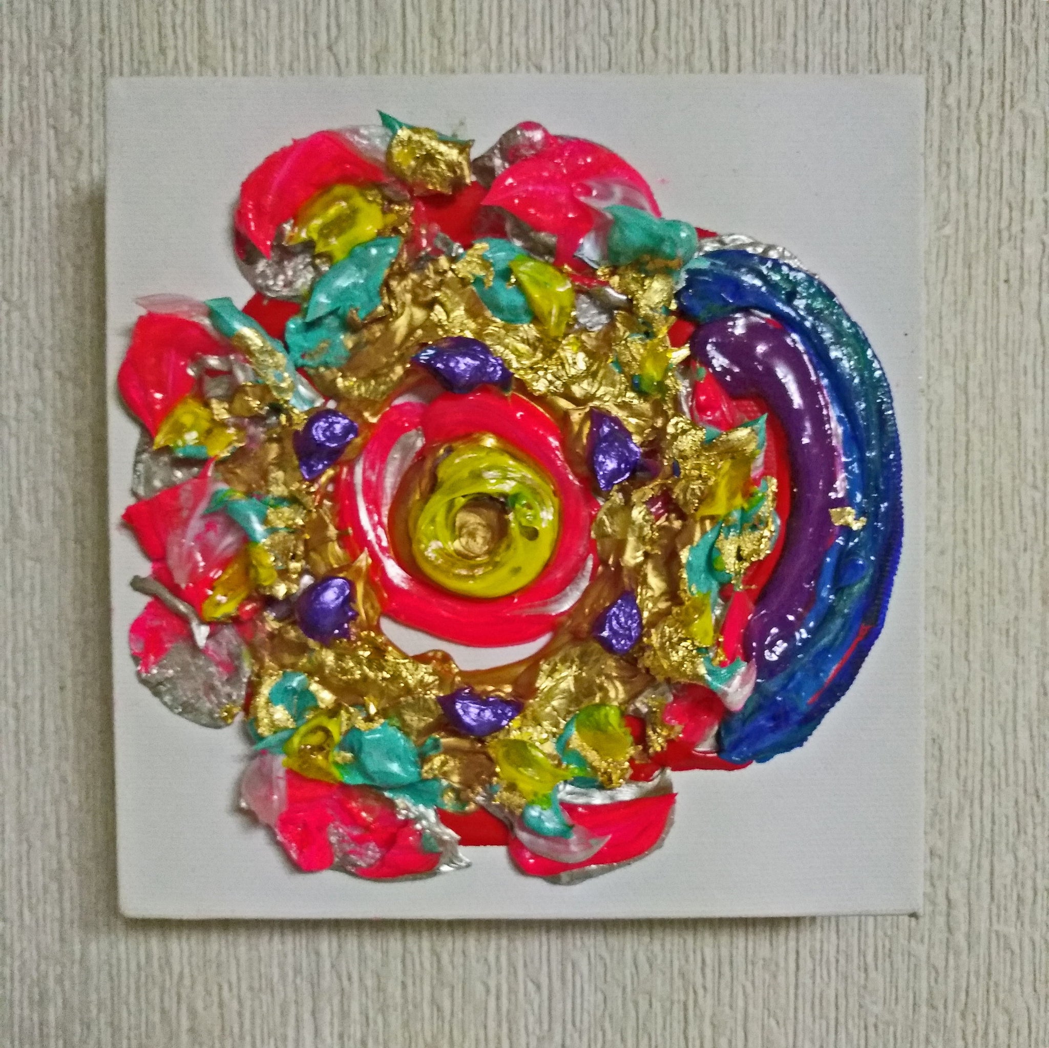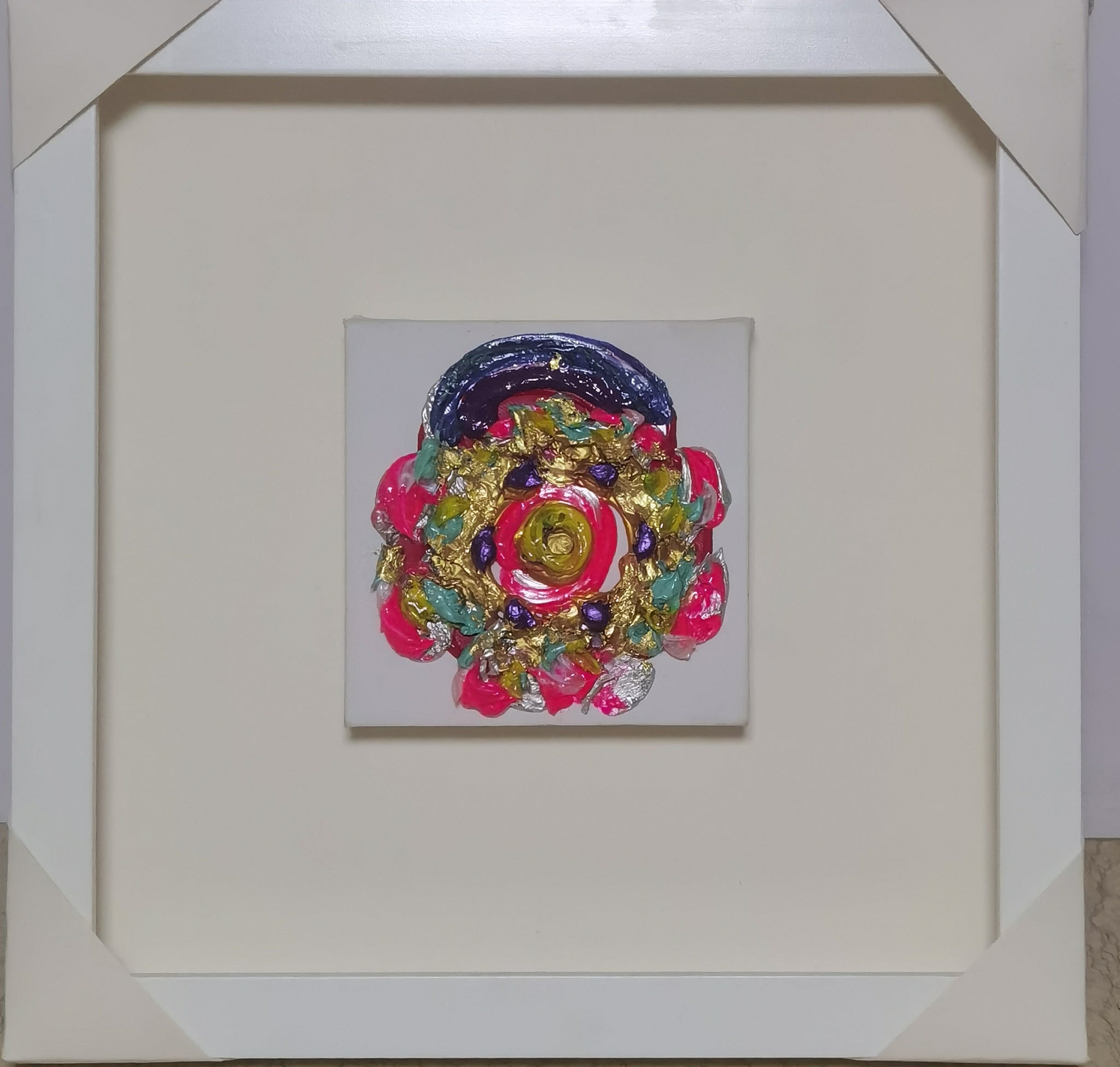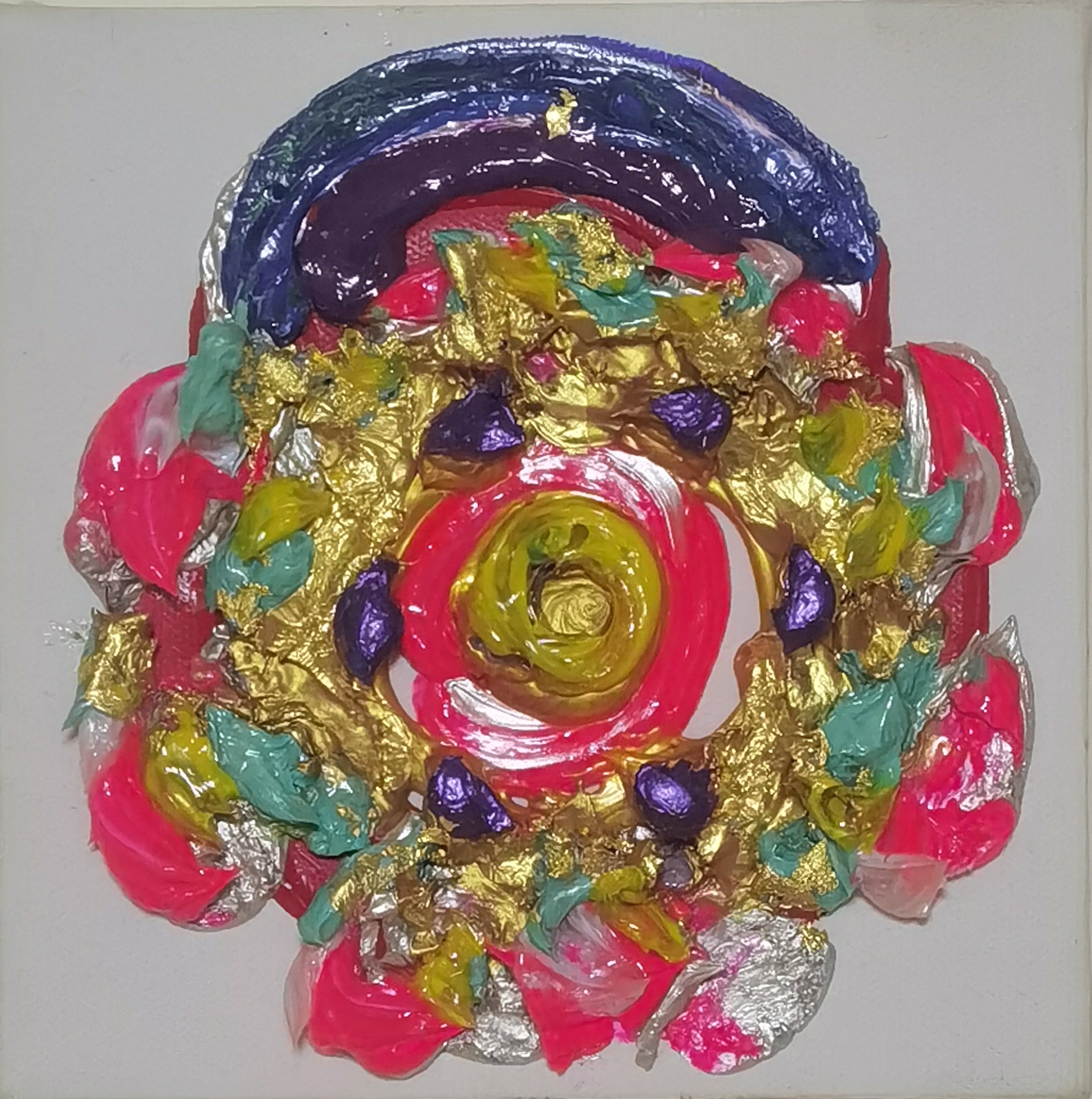 Keiko Moriuchi’s Peach of Kunlun Mountain is an arresting concentric relief composed of luxuriant impasto, iridescent pigments, and fragments of silver- and gold-leaf. Executed on a square canvas barely larger than a foot in each direction, the work attains sculptural presence through the artist’s signature technique of layering viscous acrylic and metallic foils into a rosette-like vortex that projects several millimetres from the support. Brilliant neon pinks, lapis violets, turquoise greens, and aureate shards orbit a luminous citrine core, evoking the mythical “peaches of immortality” said to ripen once every three millennia on China’s sacred Kunlun peaks.