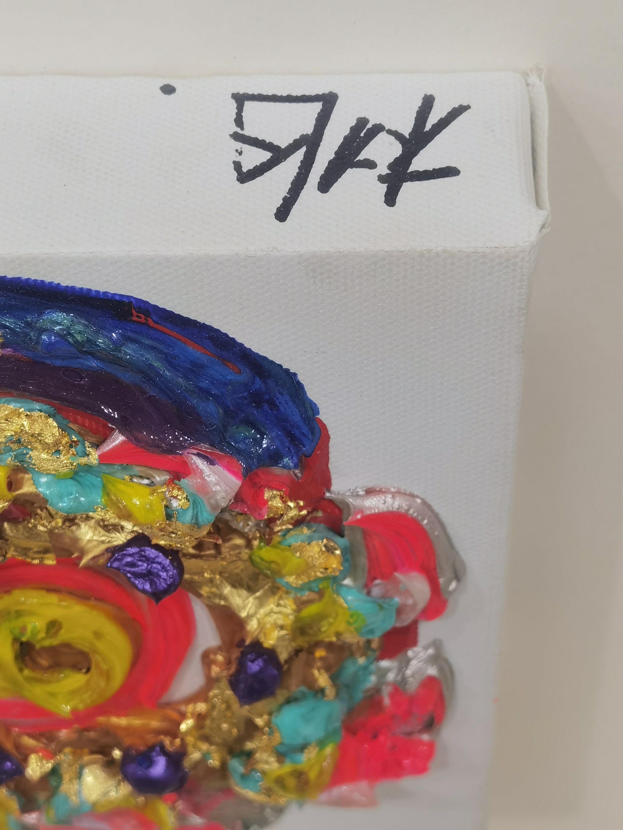 The work is preserved in very good condition. Impasto passages retain crisp edges and original gloss; metal-leaf fragments show no oxidation or lifting. No evidence of paint loss, craquelure, or over-painting under raking light. The canvas remains taut on its original stretcher and is housed in a pristine, museum-grade float frame. No immediate conservation intervention is recommended beyond standard preventive measures (stable humidity and UV-filtered lighting).