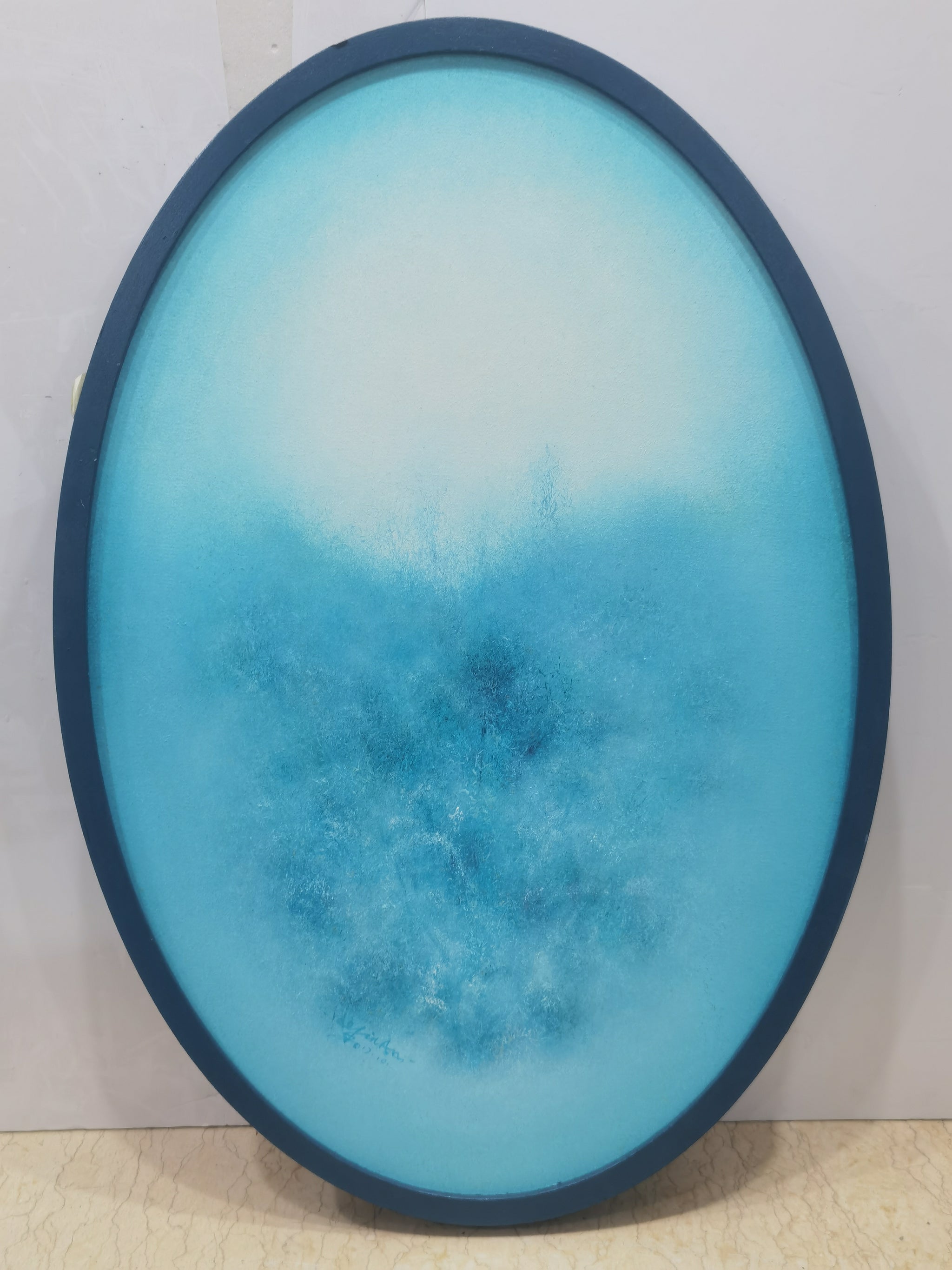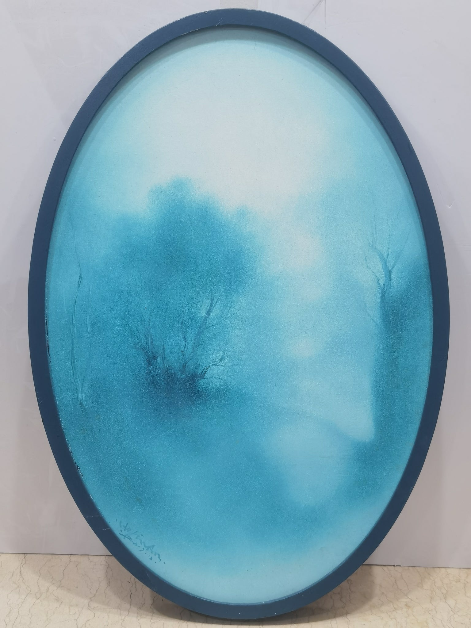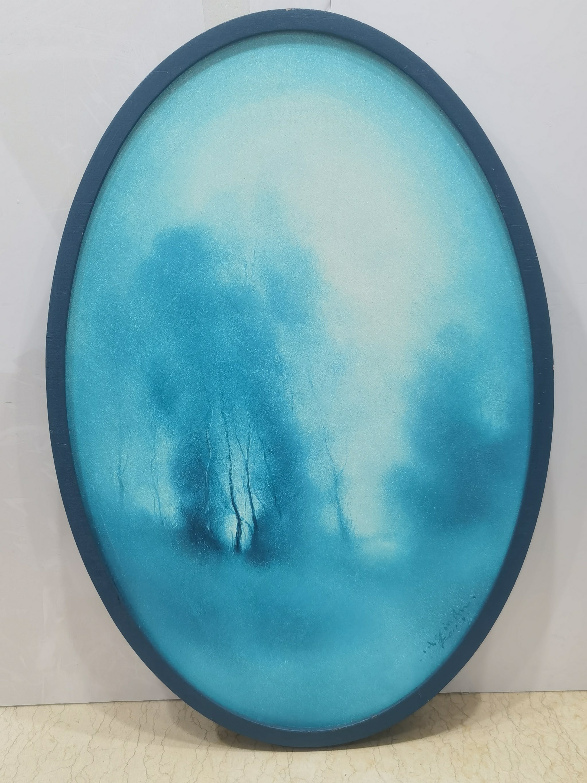 This serene triptych by Chinese contemporary artist He Jin’an, completed in 2017, comprises three oval-format oil paintings, each measuring 60 x 40 cm. Executed in a soft tonal range of ethereal blues, the works depict mist-laden forested landscapes emerging and receding into atmospheric voids. The trees and foliage dissolve into pure sensation, suggesting memory, dream, or meditation. Each painting is housed in an elegant, matching elliptical frame that echoes the gentle curvature of the compositions. All three canvases are in very good condition.