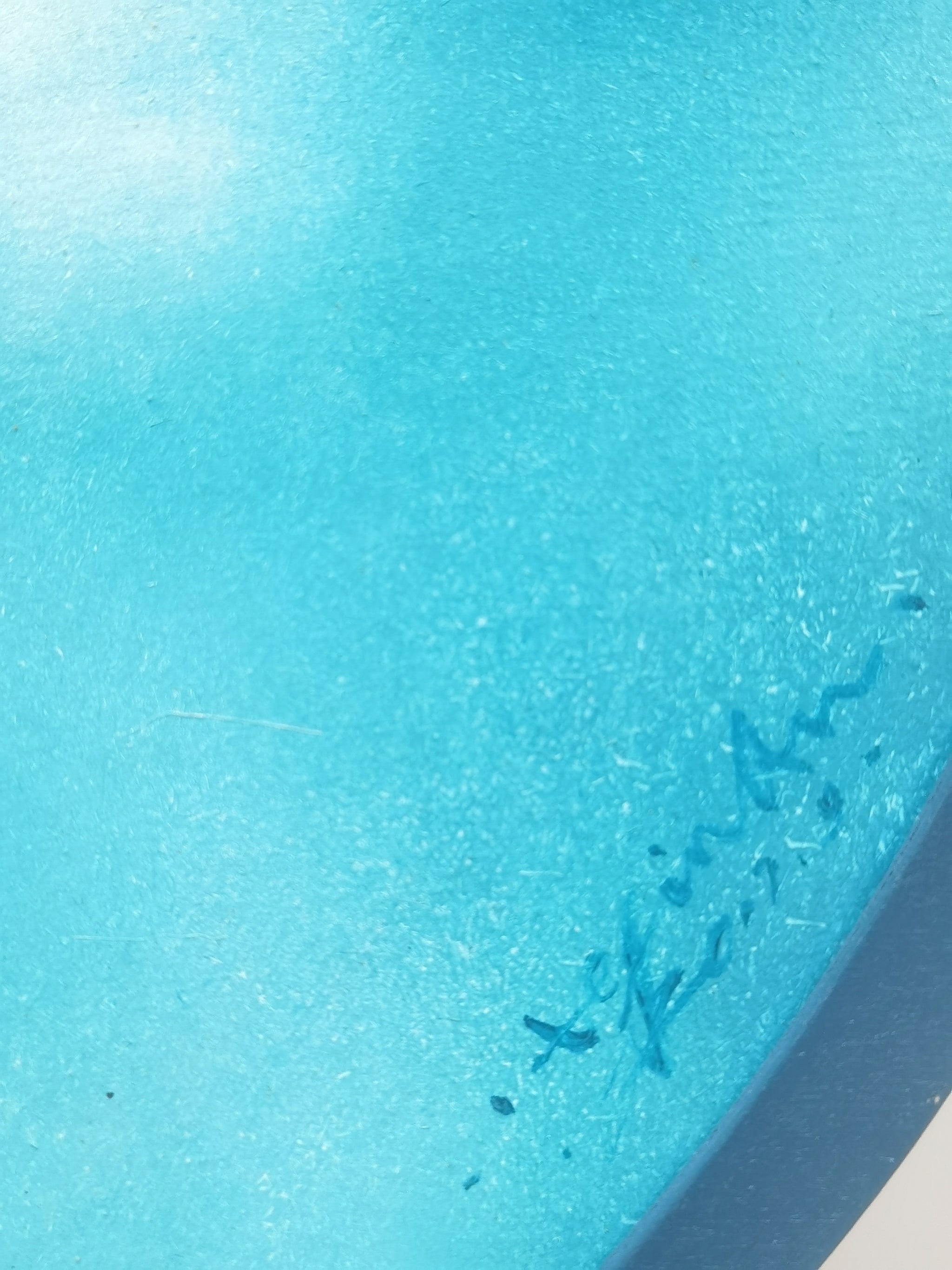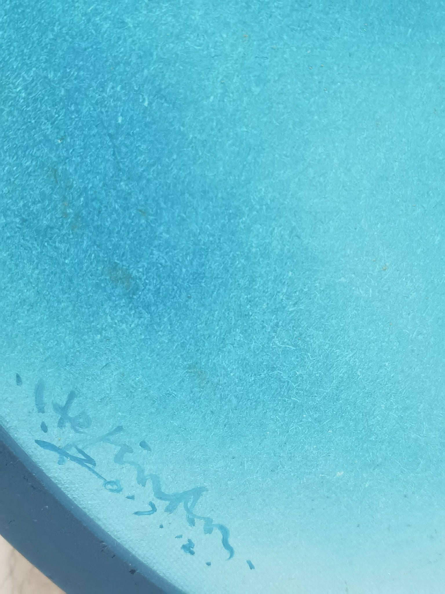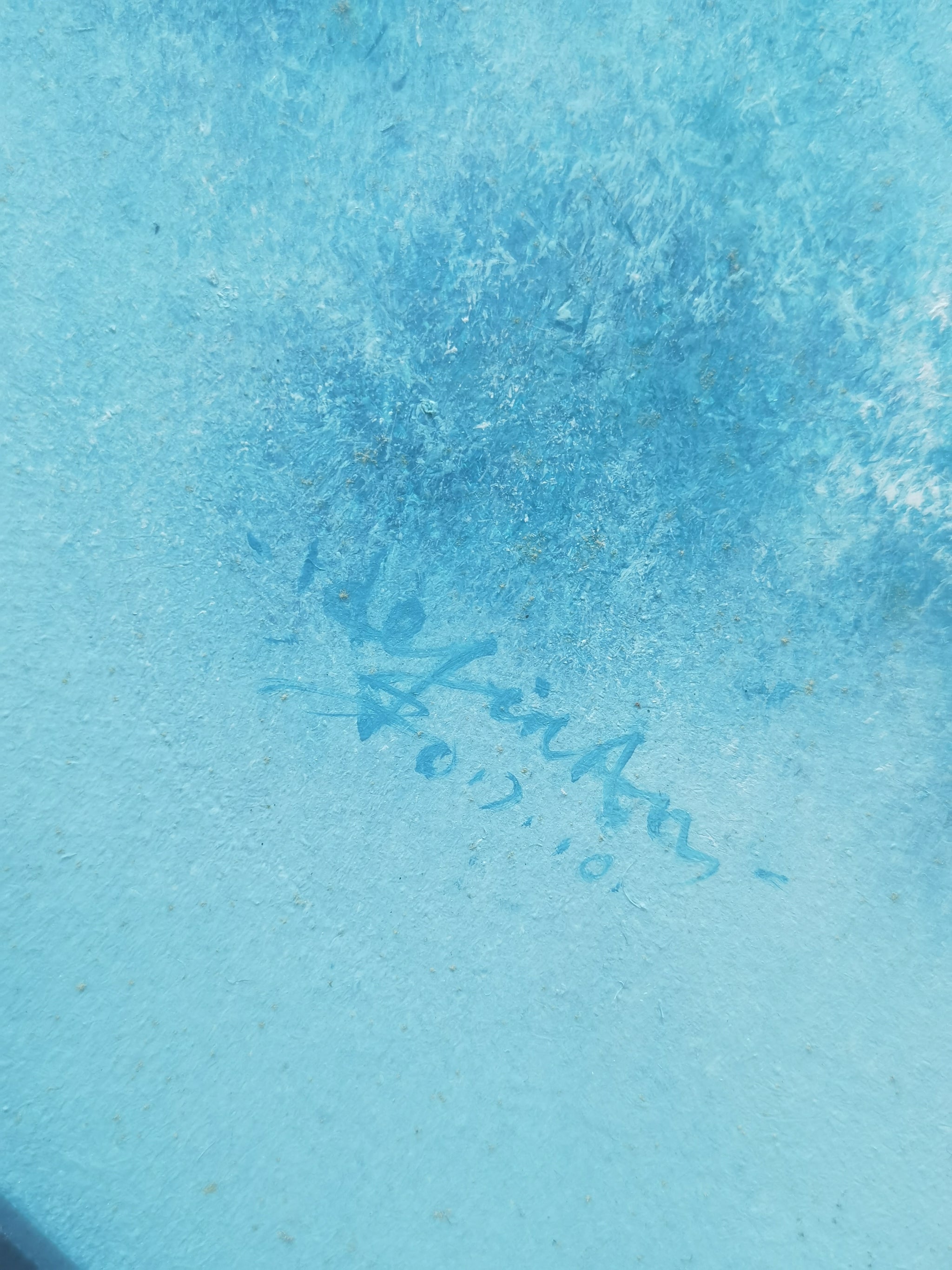This serene triptych by Chinese contemporary artist He Jin’an, completed in 2017, comprises three oval-format oil paintings, each measuring 60 x 40 cm. Executed in a soft tonal range of ethereal blues, the works depict mist-laden forested landscapes emerging and receding into atmospheric voids. The trees and foliage dissolve into pure sensation, suggesting memory, dream, or meditation. Each painting is housed in an elegant, matching elliptical frame that echoes the gentle curvature of the compositions. All three canvases are in very good condition.
