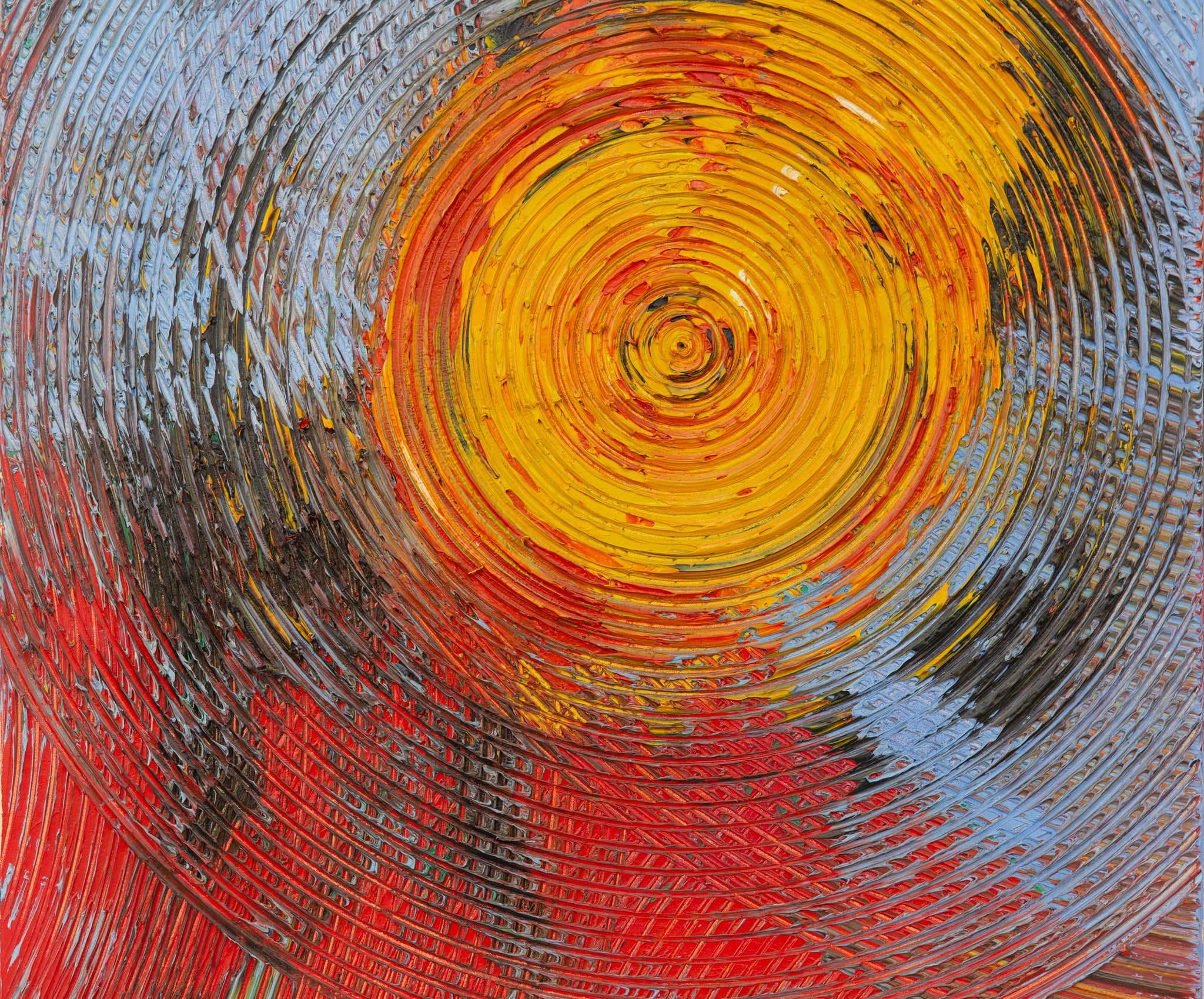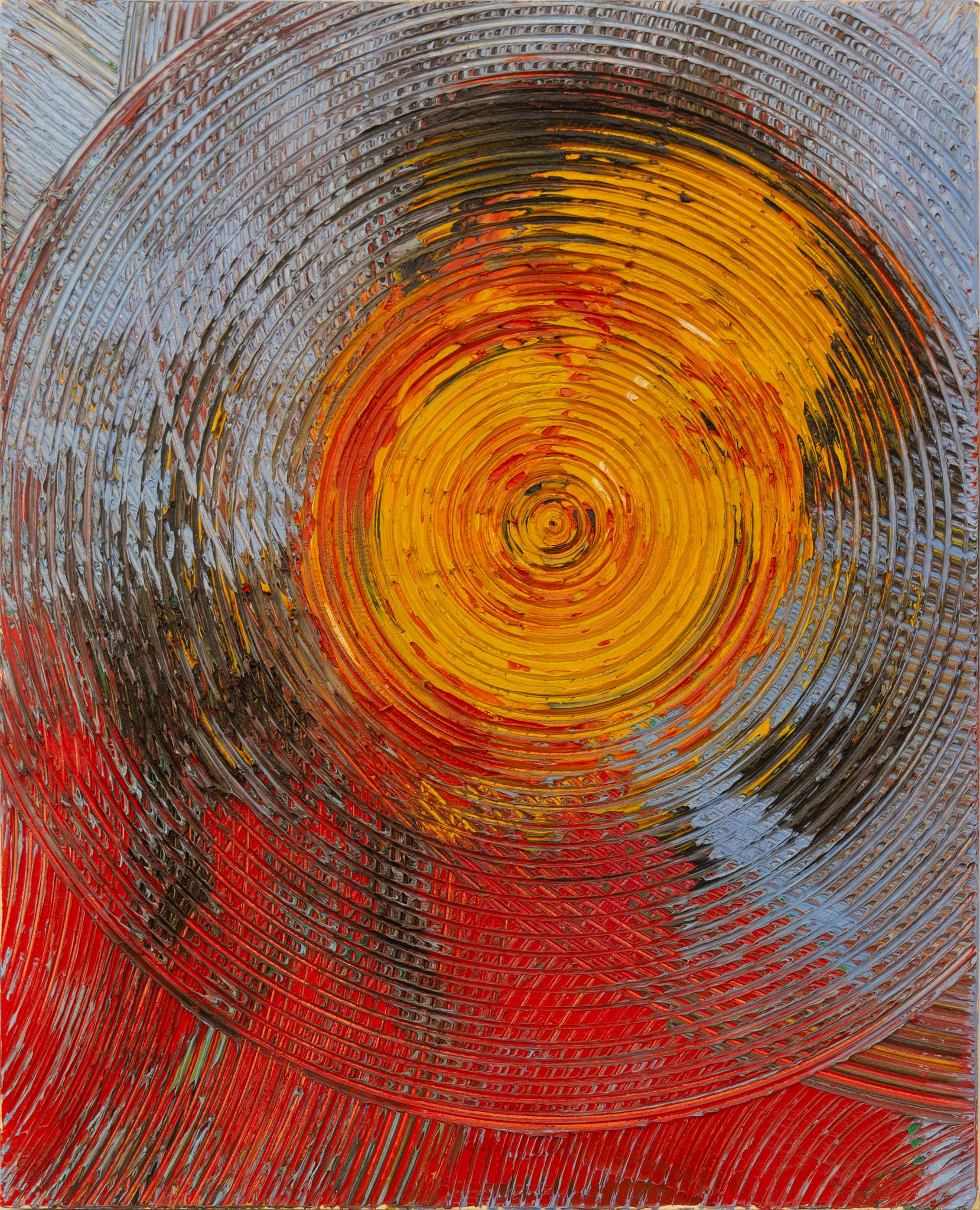 Mysterious is a striking example of Yin Zhaoyang’s mature abstract vocabulary, composed of concentric textured rings radiating outward from a vivid, fiery core of yellow and red. The swirling application of oil paint—thick, dynamic, and richly impastoed—conveys movement, energy, and an elemental intensity. The chromatic spectrum ranges from incandescent reds and yellows at the center to darker hues and cool greys toward the periphery, creating a visual and psychological vortex that draws the viewer inward.