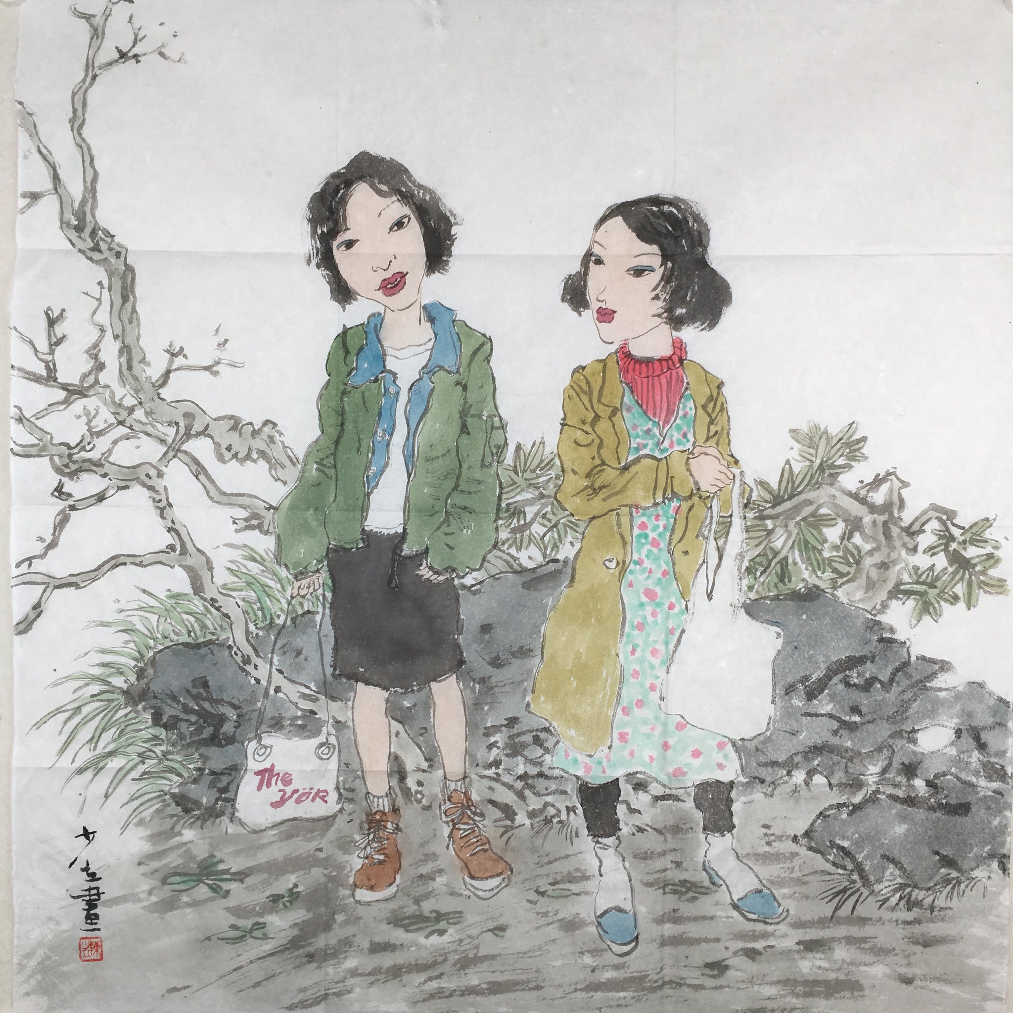 Find is a characteristically whimsical yet perceptive painting by Shaoli Chen, rendered in ink and watercolor. The composition features two young women standing in a garden-like setting, each distinct in fashion and expression. One dons a green jacket and black skirt with a bag labeled “The Joy,” while the other wears a patterned dress under a mustard coat, holding a plastic bag. The artist merges traditional Chinese brush technique with modern figuration, resulting in a humorous yet thoughtful portrayal of contemporary life.