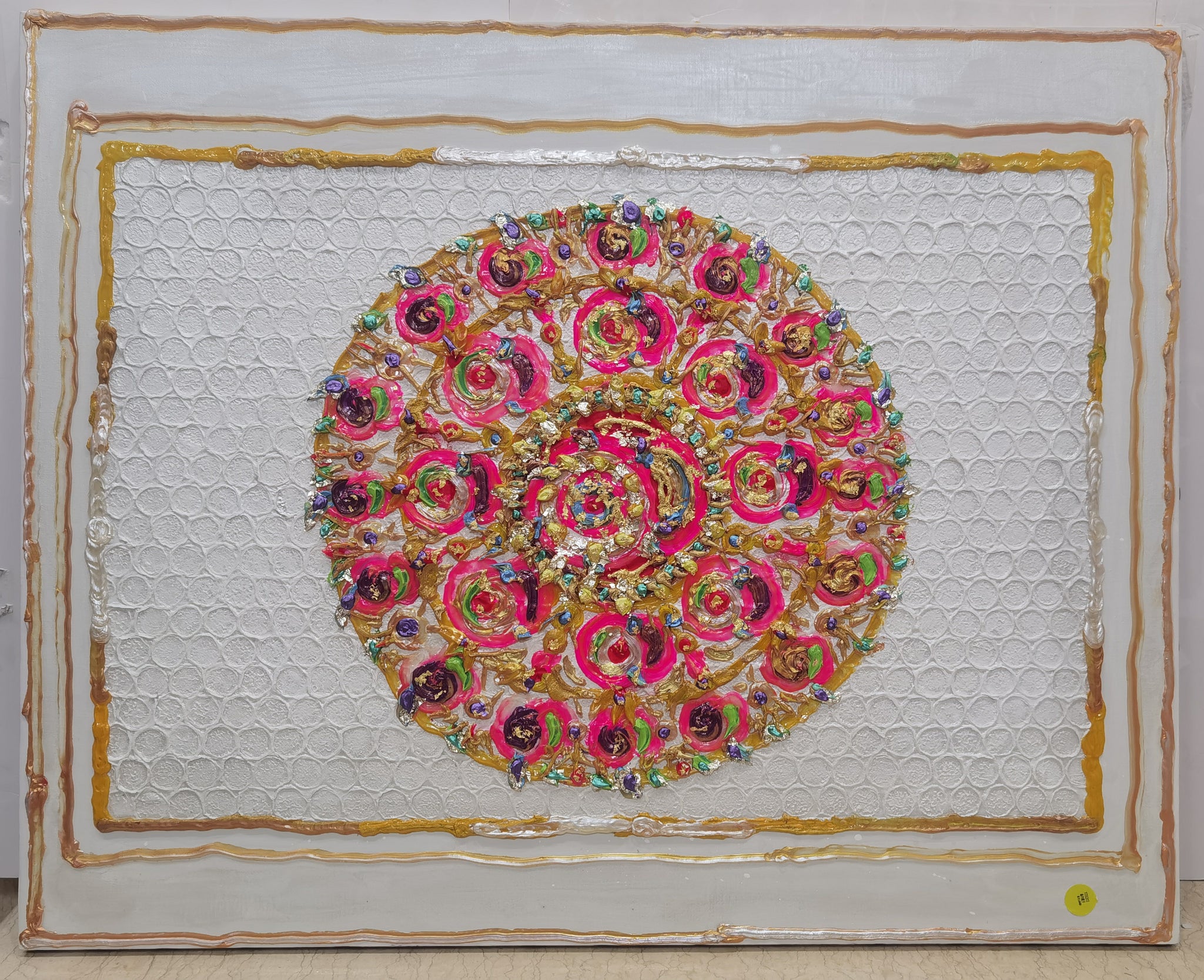 Peach of Mount Kunlun 1 is a radiant large-format mixed media painting by Keiko Moriuchi, completed in 2018. At the center of the work is a vivid circular mandala-like formation composed of concentric floral spirals in vibrant hues—pinks, reds, violets, and golds—embellished with gestural impasto and shimmering foil. The background is intricately textured with a lattice of raised circular impressions, over which the central motif seems to hover. Encased in a layered decorative border, the work exudes the aura of a sacred talisman or ceremonial tapestry.