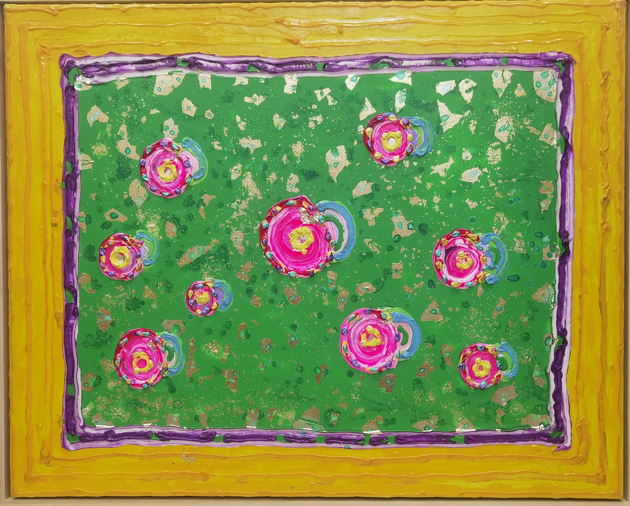 Peach of Mount Kunlun 2 is a vibrant mixed media composition by Keiko Moriuchi, created in 2018. The work features a constellation of concentric floral spirals—rendered in vivid hues of pink, red, violet, and gold—dispersed rhythmically across a textured green field. The background is flecked with gilded fragments that shimmer beneath the lacquer-like surface, creating a sense of spatial depth. Framed by layered borders in yellow and violet impasto, the painting exudes both playfulness and ritualized formality.