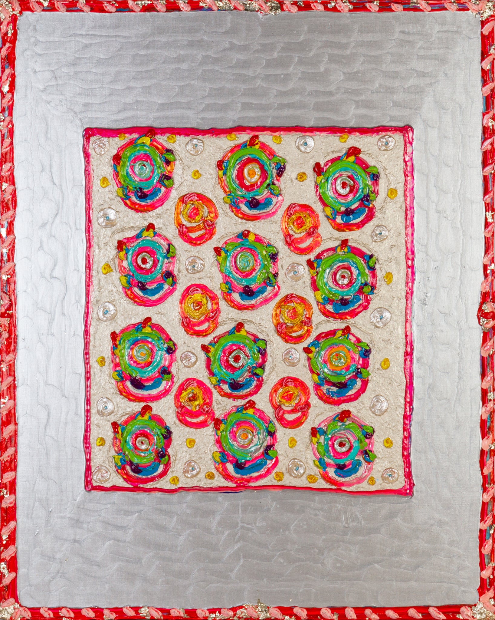 Peach of Kunlun Mountain 5 is a vivid and intricately structured mixed media work by Keiko Moriuchi, completed in 2018. The composition features a neatly gridded array of concentric floral forms—painted in lively layers of pink, red, turquoise, and green—punctuated with jewel-like embellishments and framed within three radiant borders: a reflective silver field, an inner coral-pink contour, and a textured red outer edge. The result is both rhythmic and ornamental, calling forth associations with textiles, mosaics, and ritual offerings.