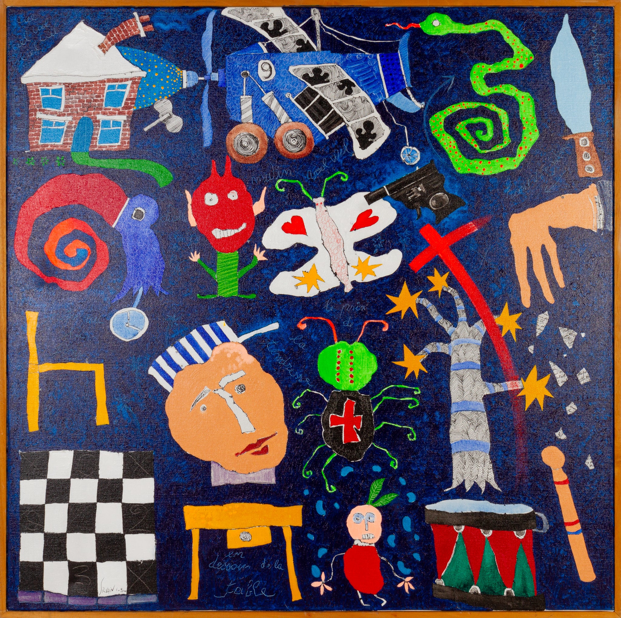 This richly detailed mixed media painting by Christian Silvain, Title:d Le prix de la tendresse (The Price of Tenderness), is a vibrant tableau filled with symbolism and storytelling. Against a deep cobalt blue background, Silvain arranges an assortment of surreal, almost dreamlike images: a prison-striped head, a green beetle, a revolver aimed at a butterfly, spirals, stars, and fragmented limbs. Rendered in a childlike, raw style with flat color fields and strong outlines, the painting balances whimsy with menace. The piece is signed by the artist in the lower left corner and presented on a stretched canvas in a wooden frame.