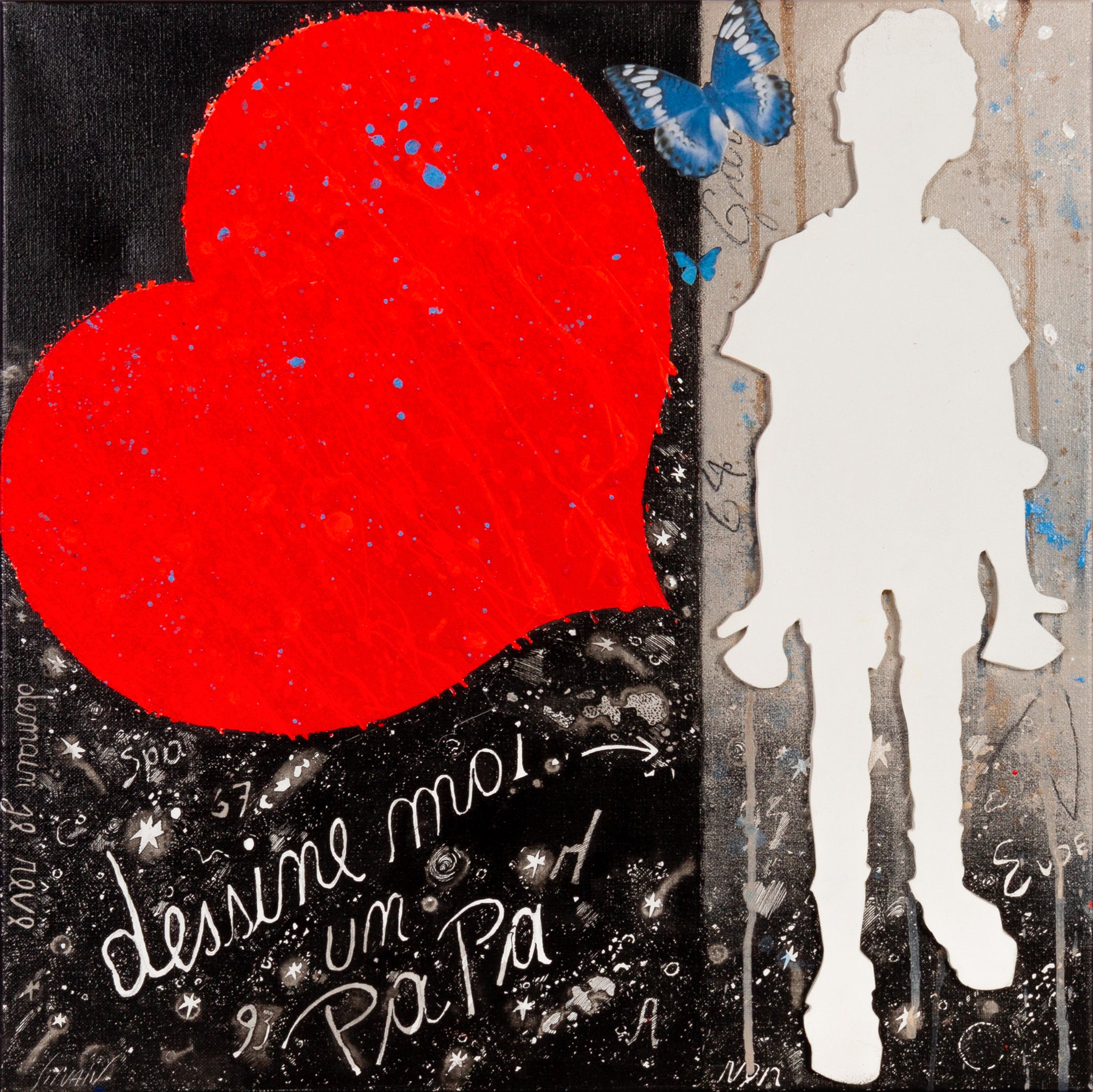 Christian Silvain’s Dessine moi un papa is a poignant mixed media composition on canvas, combining hand-drawn typography, silhouetted figuration, symbolic collage, and stark chromatic contrast. Dominating the canvas is a large, textured red heart set against a celestial black ground filled with scattered stars and handwritten inscriptions. To the right stands the white silhouette of a young child, delicately isolated in form, accompanied by fluttering butterflies and the emotionally charged French phrase "Dessine moi un Papa" ("Draw me a daddy")—a line evocative of yearning, loss, and identity. The work is signed in the lower left corner.