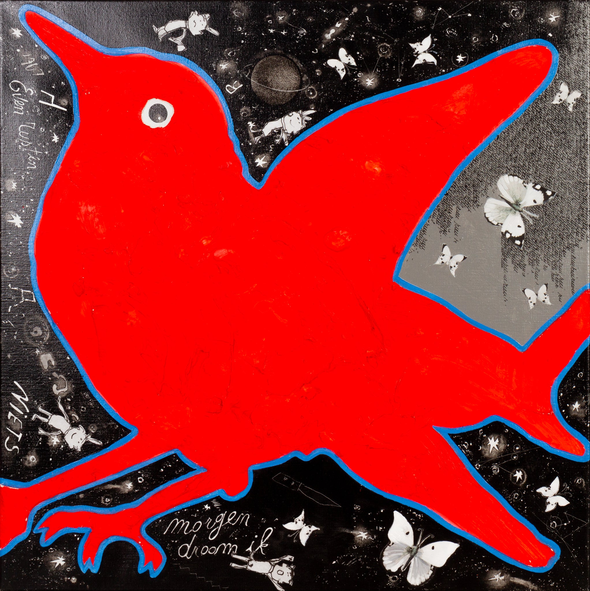 Even Rusten is a compelling mixed media composition by Belgian artist Christian Silvain, executed on canvas and measuring 60 x 60 cm. Dominating the composition is a vibrant scarlet-red bird form outlined in electric blue, its bold silhouette set against a cosmic black-and-white ground teeming with tiny, delicately rendered butterflies, stars, and playful cartoon-like figures. The textural surface integrates hand-drawn motifs, poetic script (“morgen droom ik”), and collaged elements. The Title:, written on the verso, translates from Dutch as “Just Resting,” an ironic counterpoint to the restless energy of the surrounding iconography.