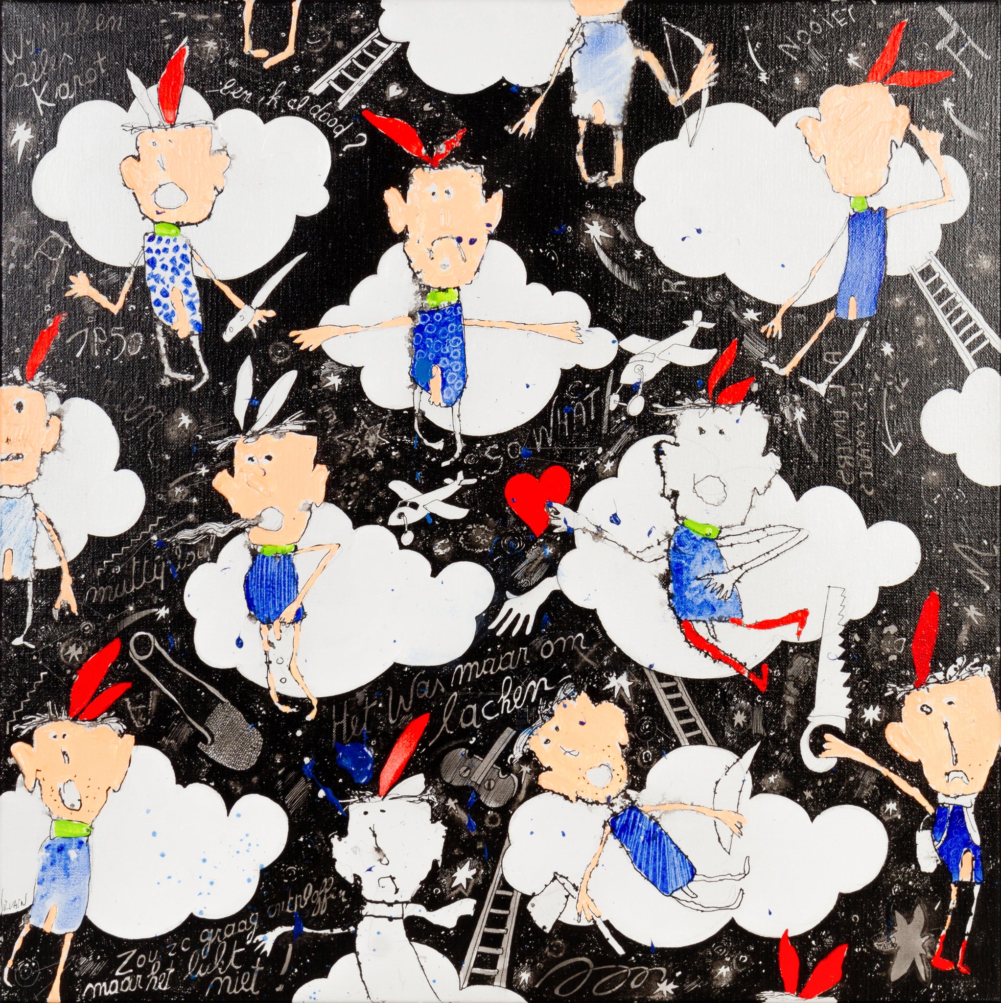 Christian Silvain’s Ontploffen is a vibrant mixed media work on canvas, measuring 60 x 60 cm, filled with a kinetic constellation of childlike figures hovering on clouds, punctuated by floating ladders, scattered text, symbolic imagery, and stark black voids. The characters, rendered in a cartoonish yet emotionally charged style, are set against a cosmos-like background, their exaggerated expressions ranging from anxiety to absurdity. The visual density is amplified by scribbled phrases in Dutch, enigmatic objects, and saturated color accents—particularly red feathers and blue outfits—which inject both visual rhythm and psychological tension.