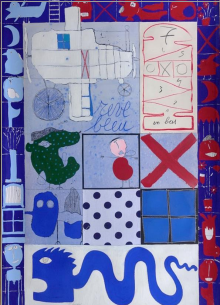 Christian Silvain’s Rêve Bleu is a large-format mixed media work on paper, measuring 106 x 77.5 cm. The composition is structured as a dynamic visual grid, divided into twelve distinct compartments filled with stylized iconography: a biplane, a serpent, cartoonish figures, polka dots, and cryptic symbols. Rendered in a bold palette dominated by ultramarine, crimson, and black, the work evokes a dreamlike schema of archetypal childhood motifs. The Title:, meaning “Blue Dream” in French, is inscribed centrally—anchoring the piece’s tone of introspection and fantastical logic.