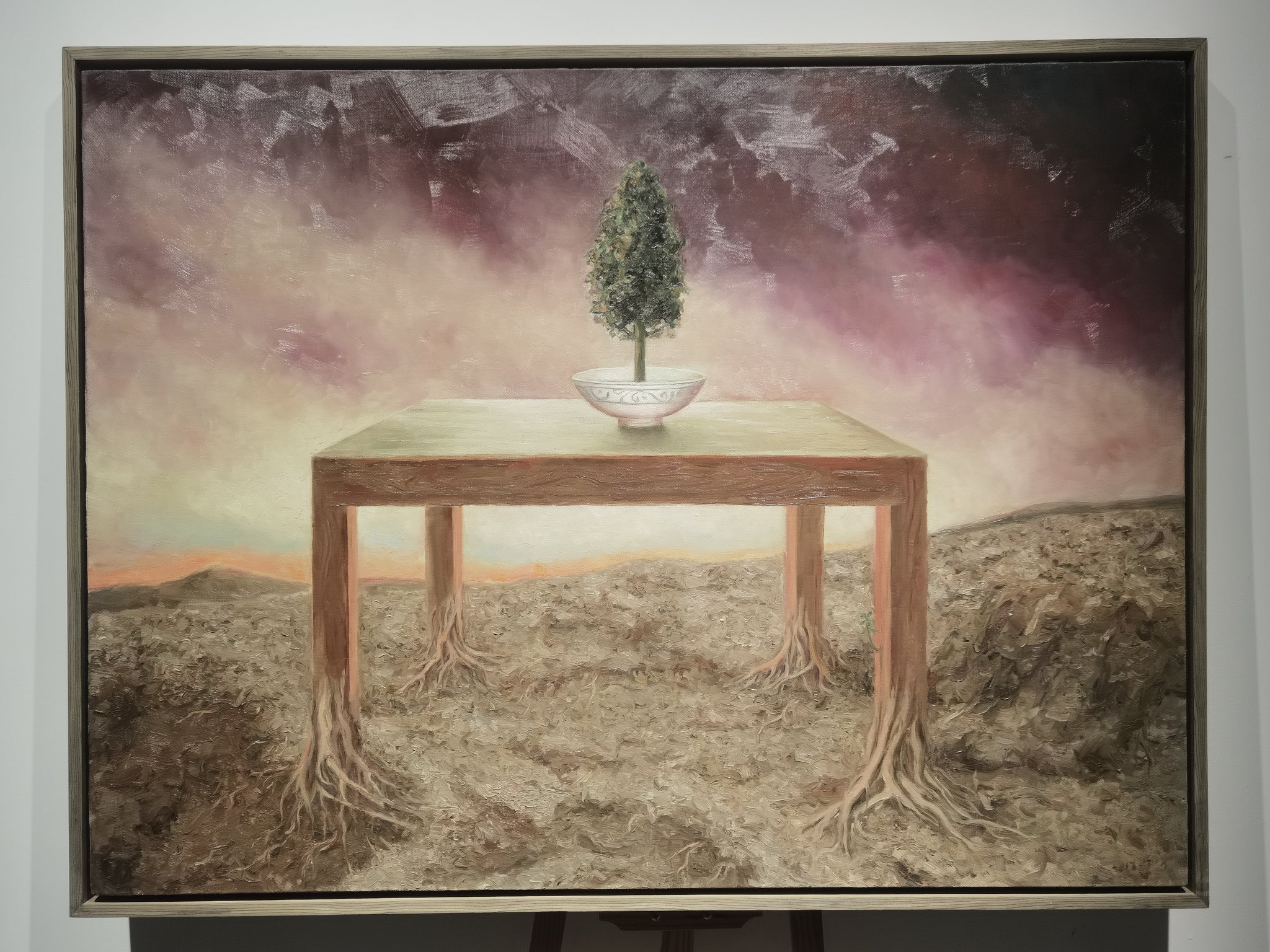 The painting leans toward surrealism and metaphysical symbolism, with overtones reminiscent of Magritte or de Chirico, where familiar objects are recast in uncanny settings. Yue Zheng’s brushwork combines realism in form with abstraction in mood and color, reinforcing the dreamlike ambiguity. The bonsai tree—a traditional symbol of cultivation and control—is juxtaposed with the raw, rooting force of nature extending beneath the table.