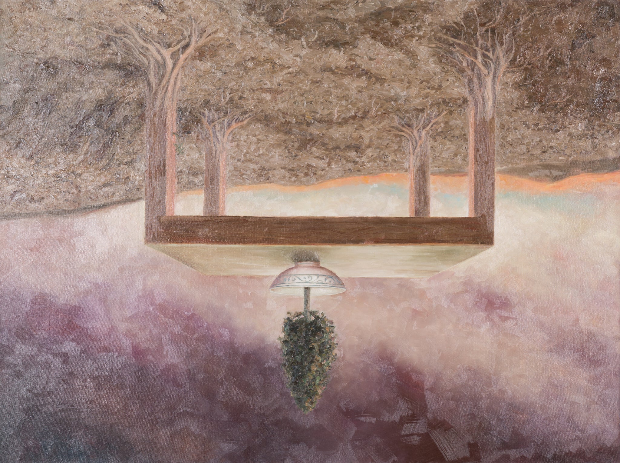 The Tree by Yue Zheng is a symbolically charged oil painting that presents a solitary table rooted firmly into an earthy landscape, with its legs transforming seamlessly into tree roots. Atop the table sits a potted bonsai, echoing the natural theme. The tableau is rendered with a soft, dreamlike palette of purples, browns, and oranges, creating a surreal landscape where the lines between natural and constructed, cultivated and wild, begin to blur.