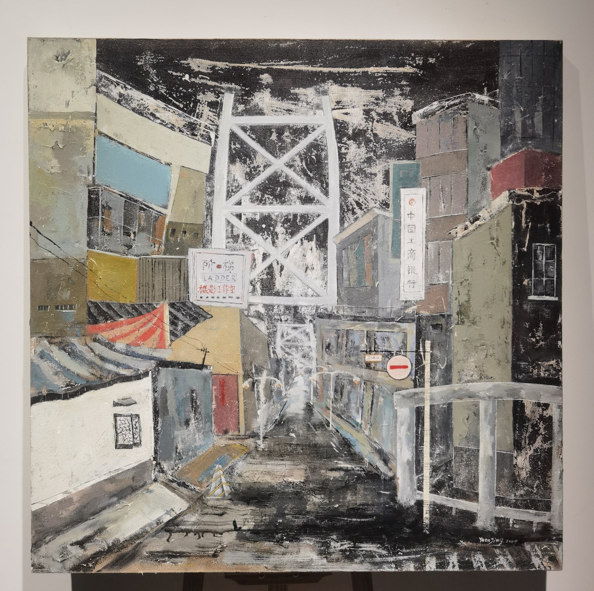 Street View by Jing Yuan is a square-format oil painting executed in 2009, measuring 90 x 90 cm. Rendered in a layered, textured impasto style, the composition presents a gritty urban alleyway framed by closely stacked architectural forms. A steel bridge structure looms in the background, while various signboards, shopfronts, and traffic markings provide a sense of realism and spatial complexity.