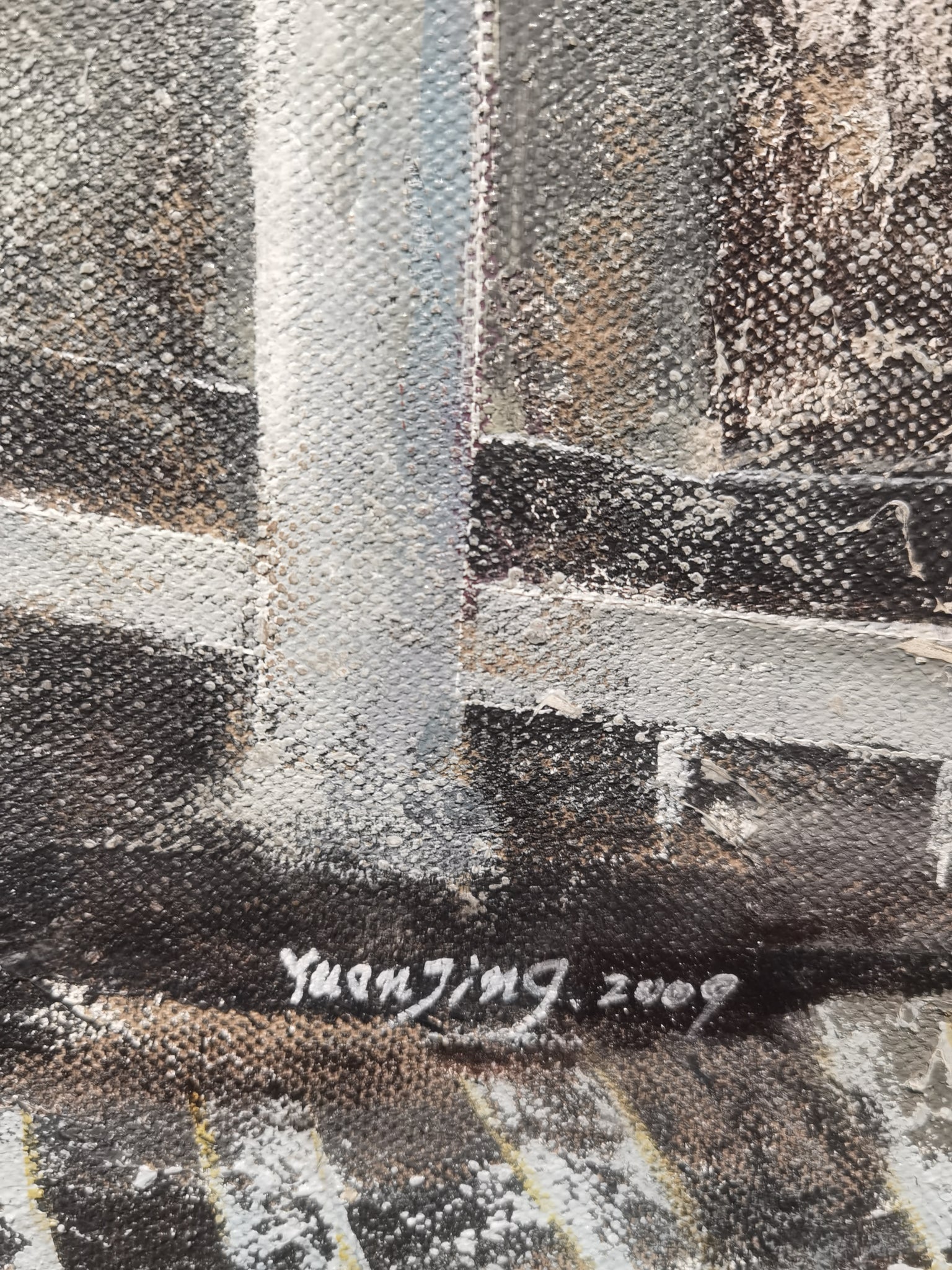 Jing Yuan’s style in this piece draws from urban realism fused with modernist abstraction. The raw surface texture and fractured planes recall elements of Cubism and Brutalism, while the muted palette, punctuated with flashes of red and ochre, evokes post-industrial melancholia. Influences may include Liu Xiaodong’s urban narratives or the structural compositions of early European modernists.
