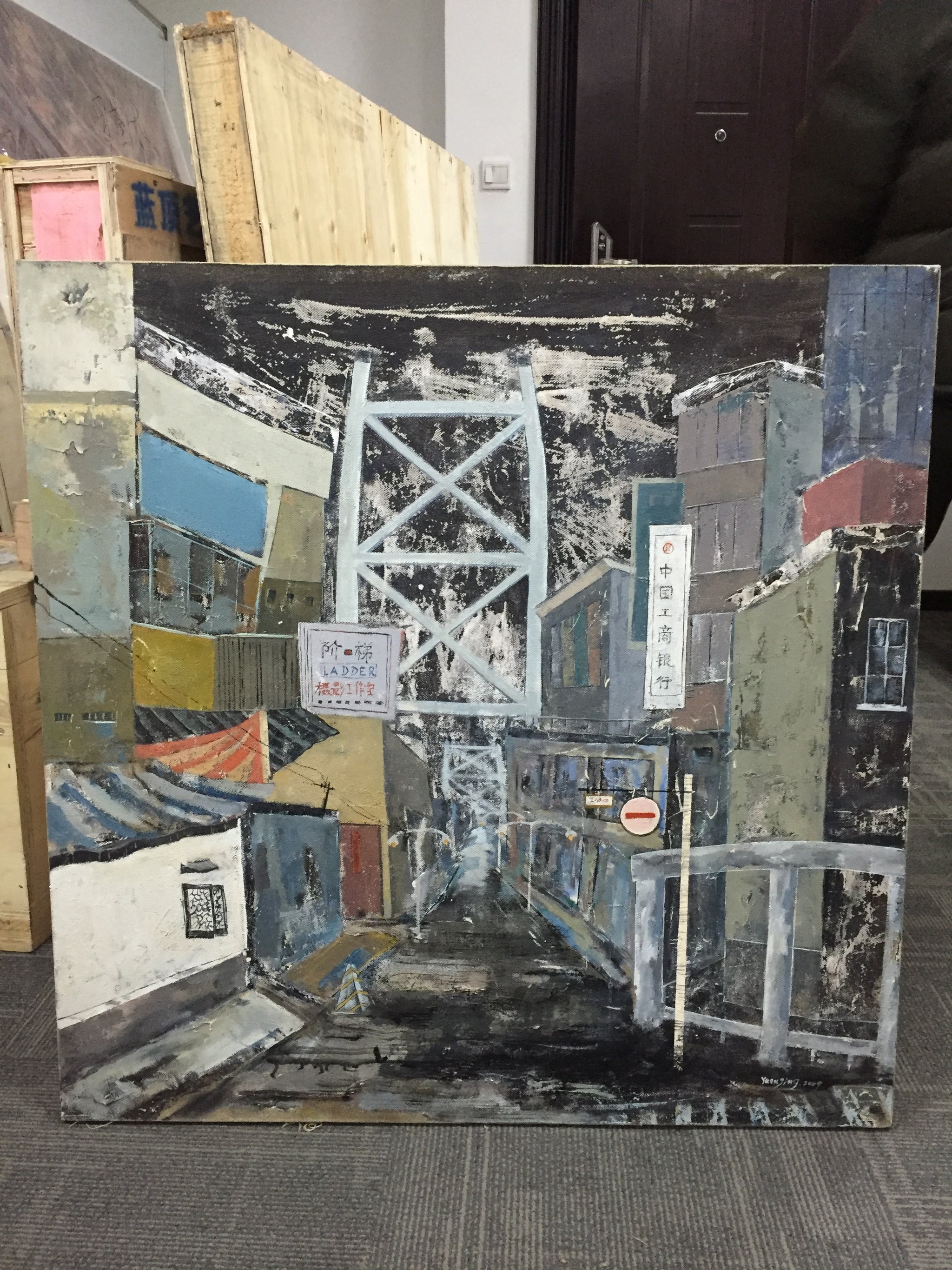 Painted in 2009, Street View emerged during a period of intense urbanization and cultural transformation in China. Artists of this era often turned their attention to the visual language of the everyday—construction sites, alleyways, signage—to record the rapid redefinition of space and social identity. The painting captures not only the built environment but the tension between preservation and erasure in modern Chinese cityscapes.