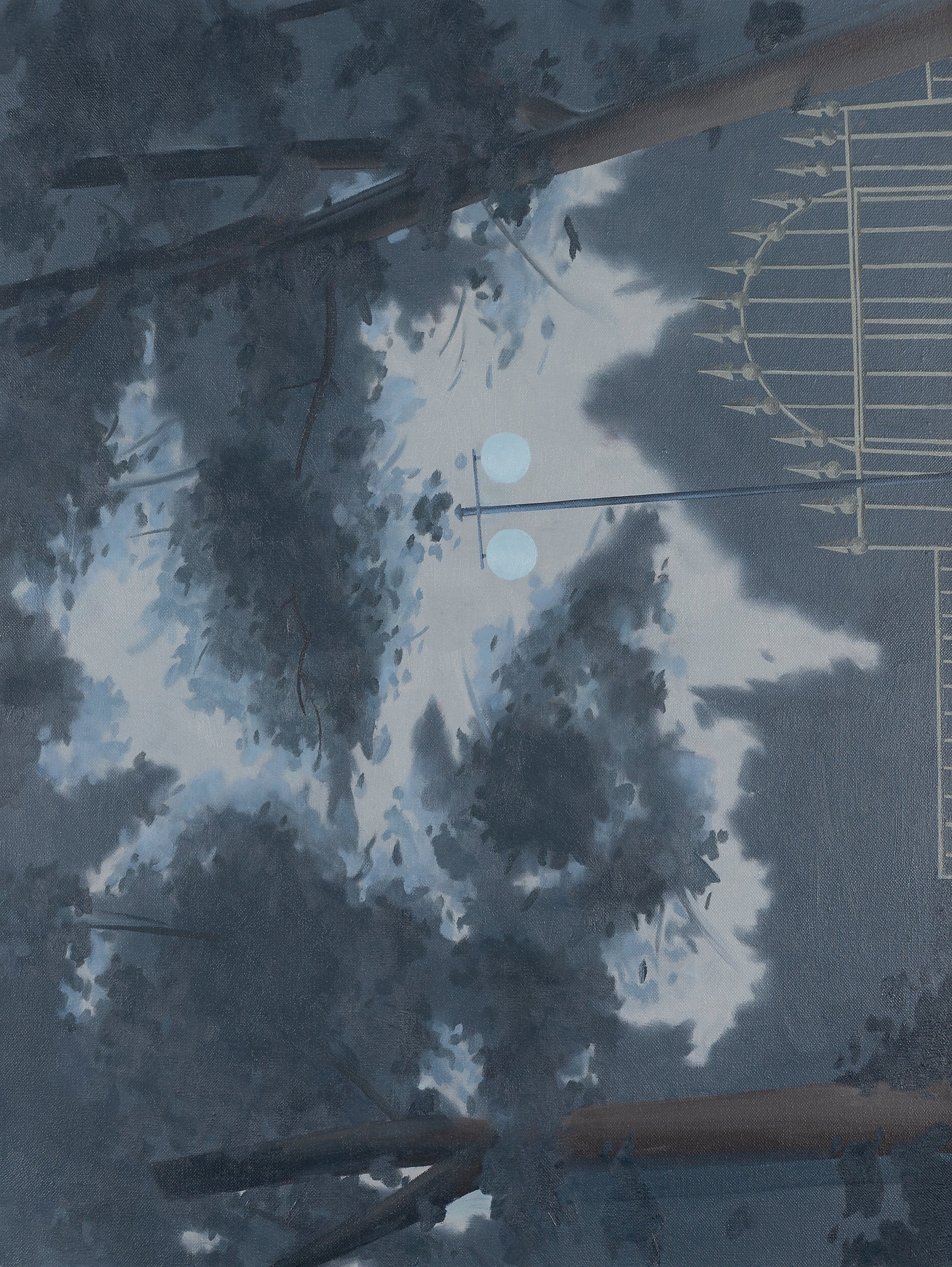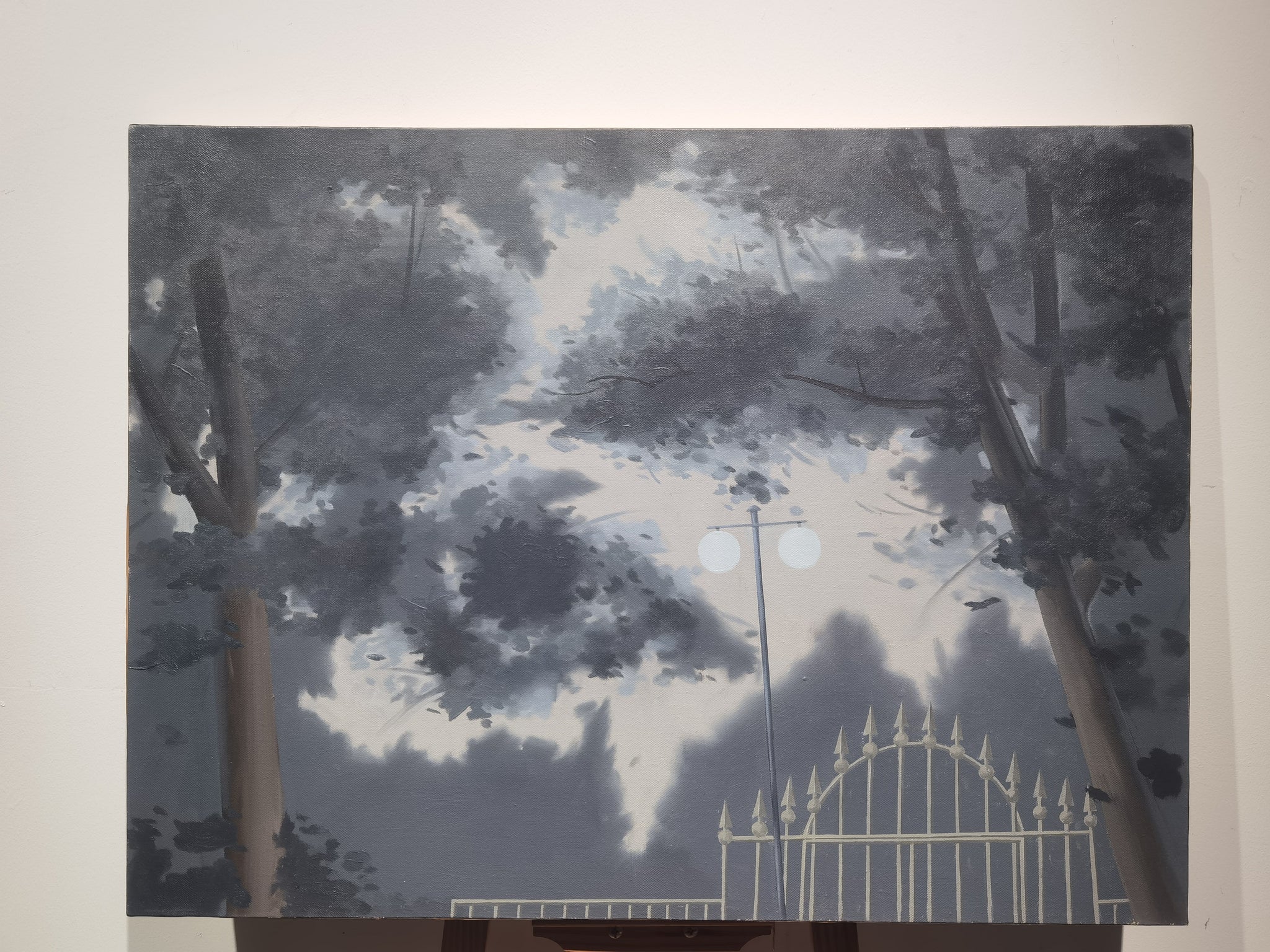 Han Wu’s style in this work leans toward magical realism with a meditative tonal palette and careful modulation of light and shadow. The atmospheric depth and moody quietude evoke comparisons to the surreal calm of René Magritte’s nocturnes, while the formal clarity and focus on stillness suggest influence from Symbolist traditions. Wu’s precise control over form and contrast allows the work to function both as landscape and metaphor.