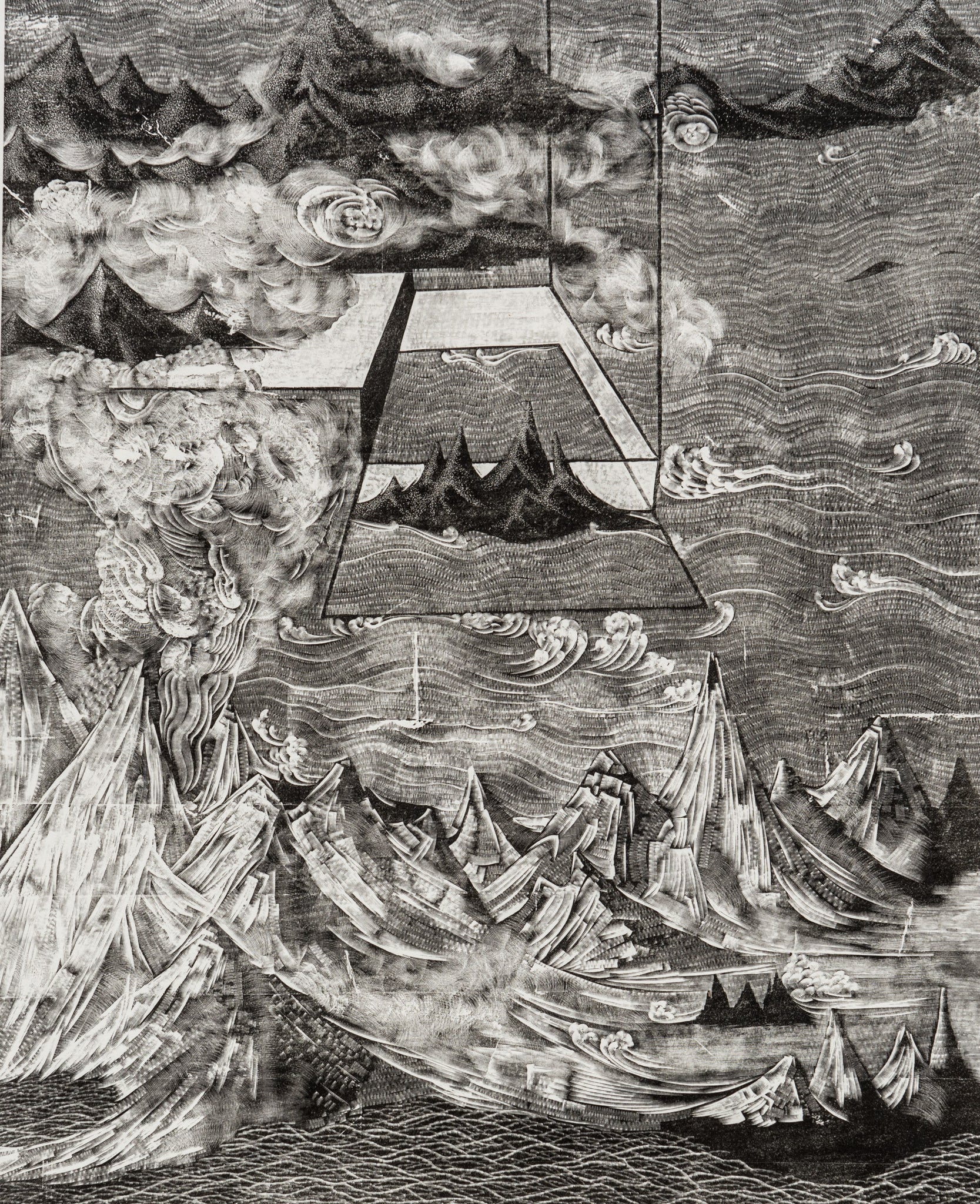 Na Xu’s Good as Water Four is a monochromatic woodcut measuring 40 × 50 cm. The composition interlaces flowing, organic forms—mountains, rivers, and clouds—with a striking geometric structure reminiscent of architectural frameworks. Executed with refined carving techniques, the work displays a delicate balance between traditional landscape motifs and modern design sensibilities.