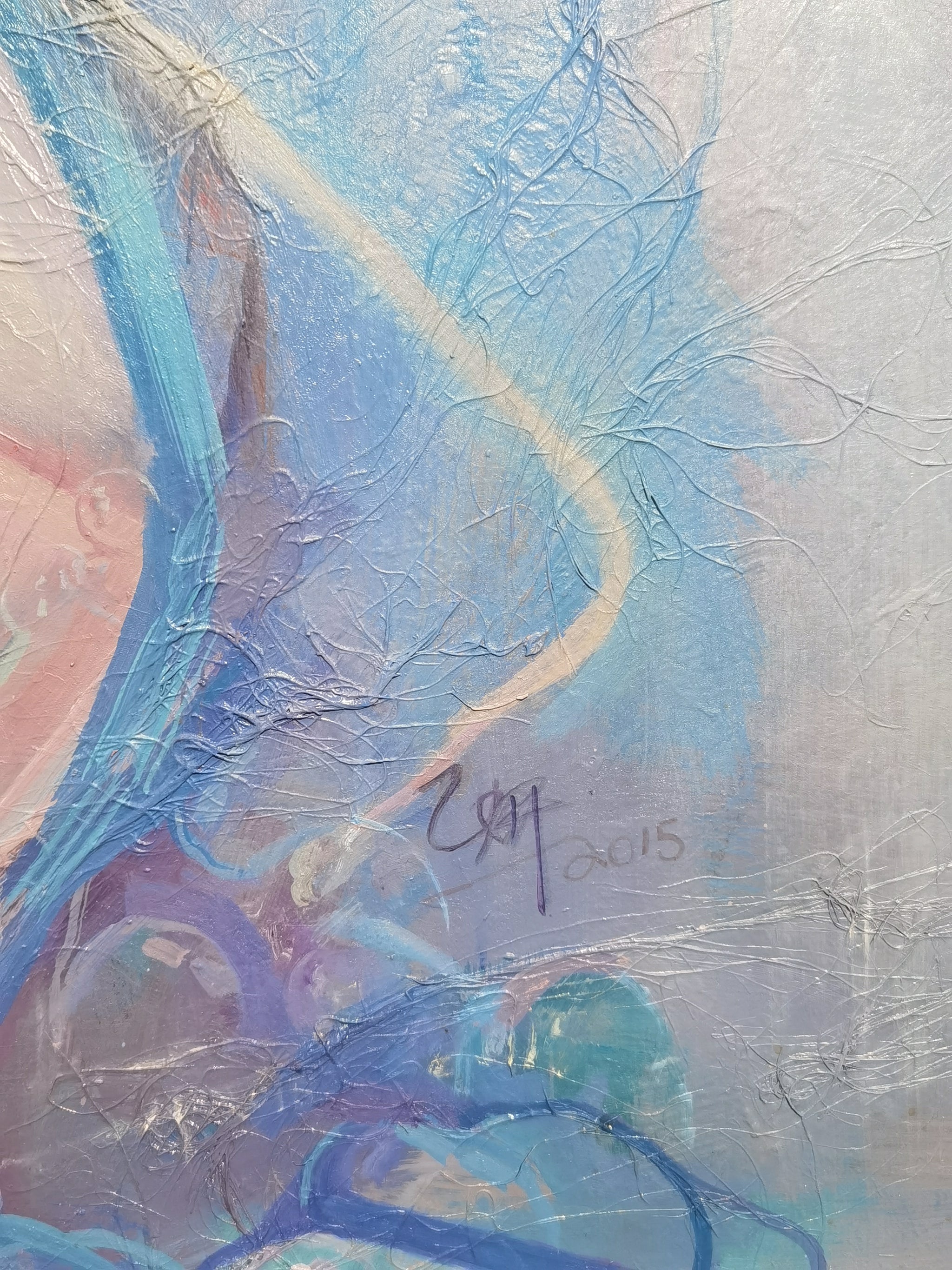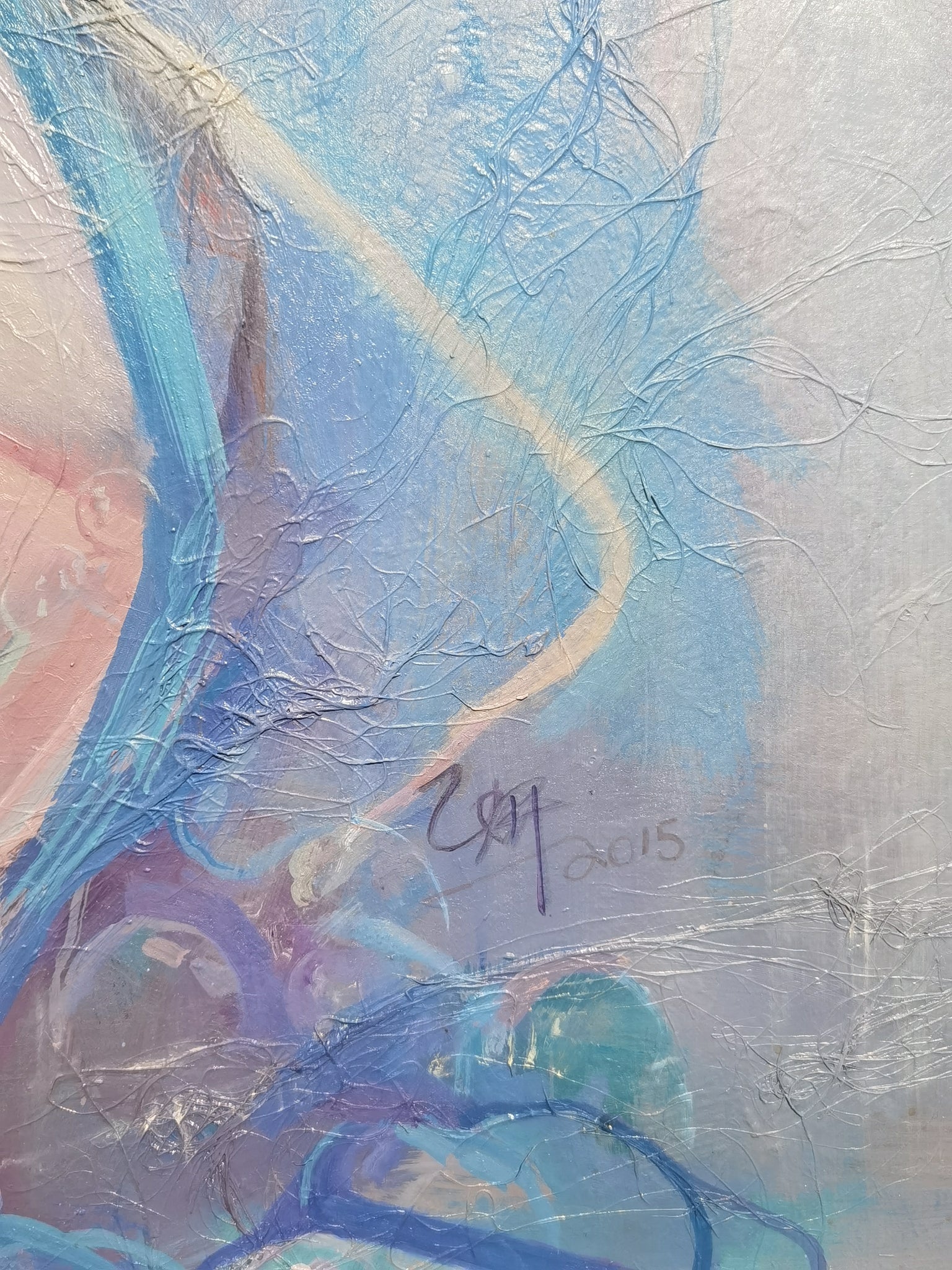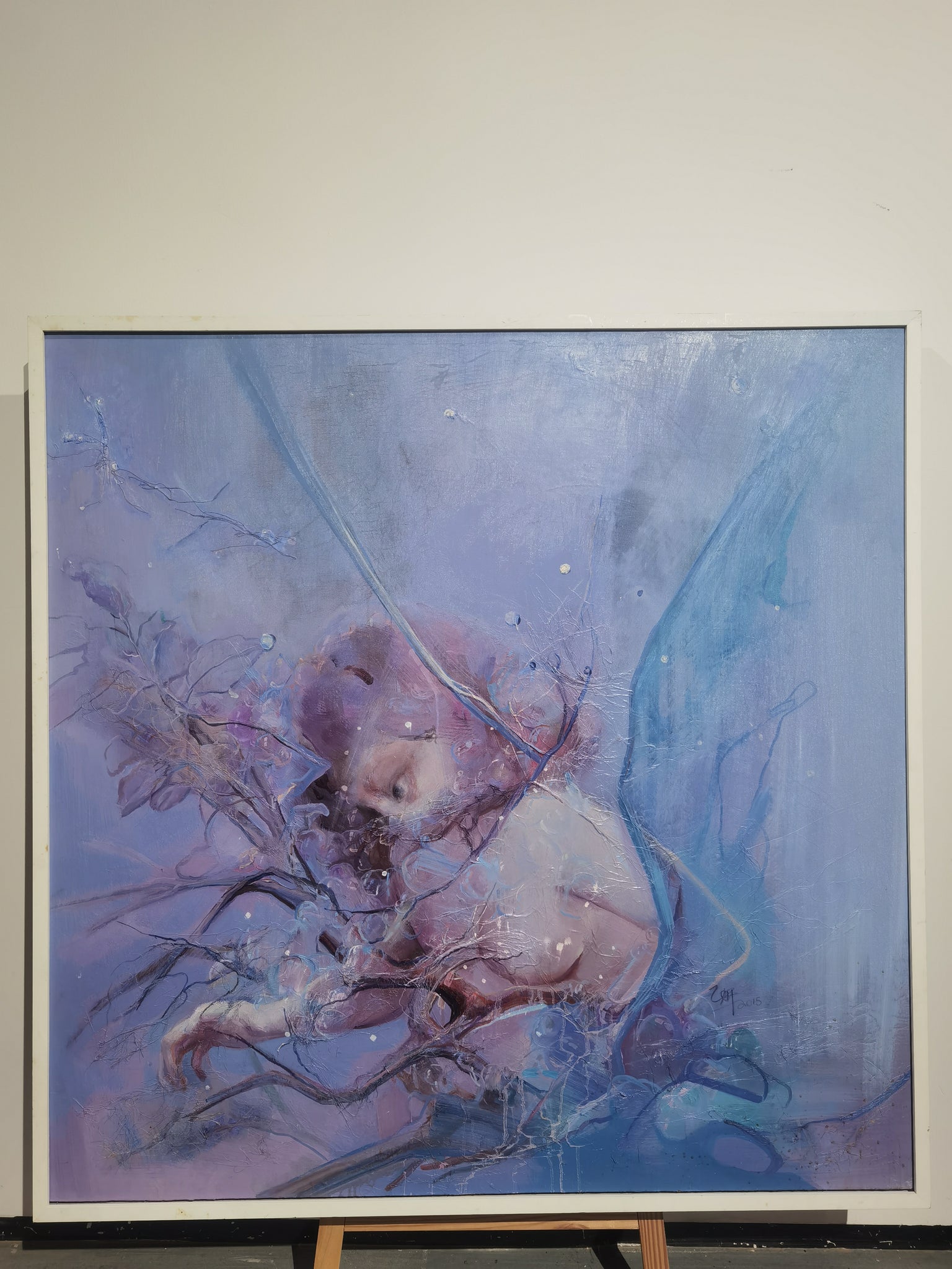 The painting blends surrealism with lyrical abstraction, anchored in contemporary Chinese visual poetics. Yan Yi’s style evokes comparisons to Symbolist and fantastical figuration, with echoes of Odilon Redon’s mysticism and Zdzisław Beksiński’s dreamscapes, though with a gentler, more aqueous sensibility. The immersive color palette and metamorphic anatomy underscore a deeply personal visual language that traverses the boundary between reality and imagination.