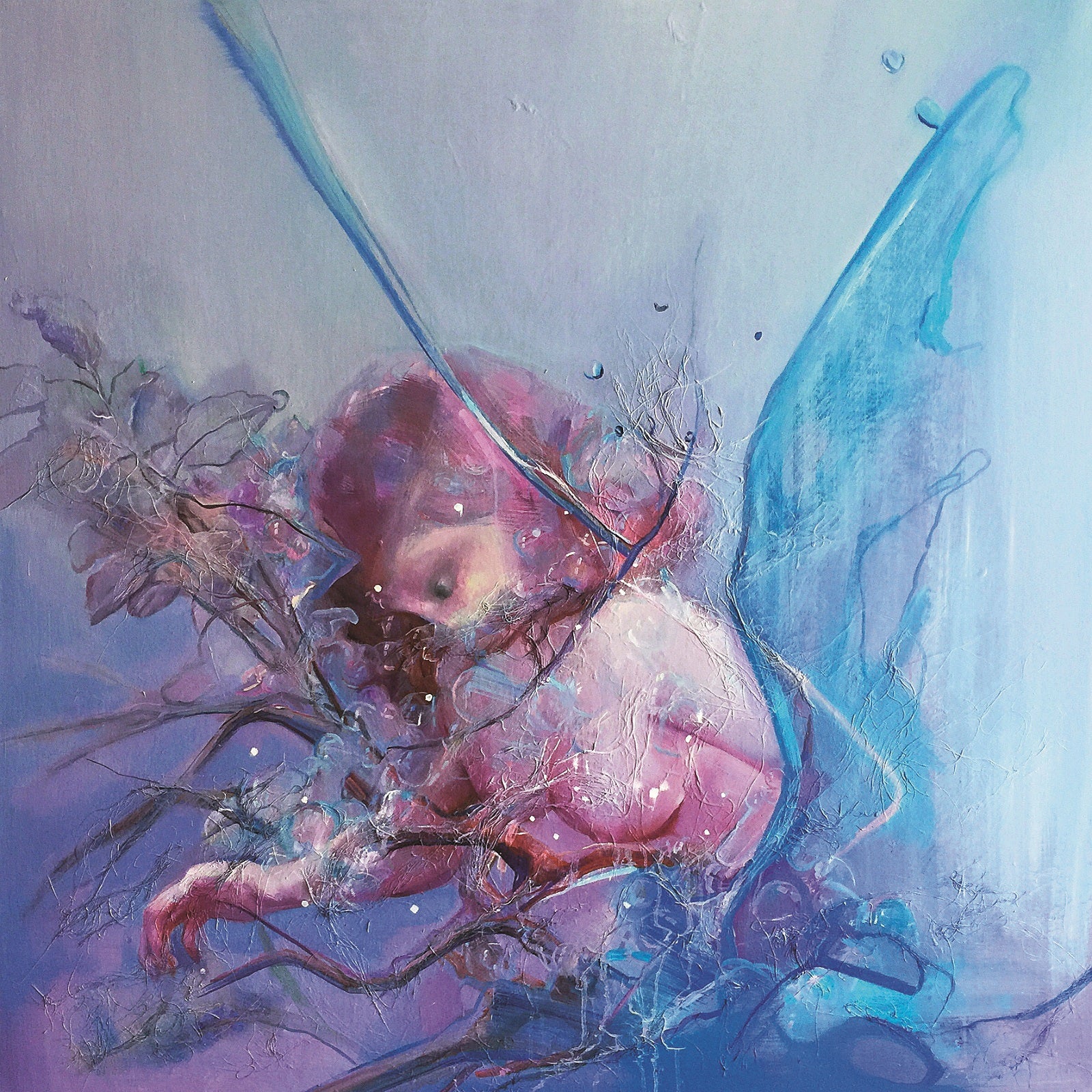 Yan Yi’s Time is the Mind of the Ocean is a striking oil painting that envelops the viewer in a dreamlike underwater cosmos. Executed on a square-format canvas, the work features a surreal figure—half-submerged, half-transfigured—surrounded by a delicate tangle of organic branches and rippling fluid forms. Rendered in opalescent shades of lavender, rose, and turquoise, the composition is ethereal yet richly textured, with paint application that simulates both translucence and depth.
