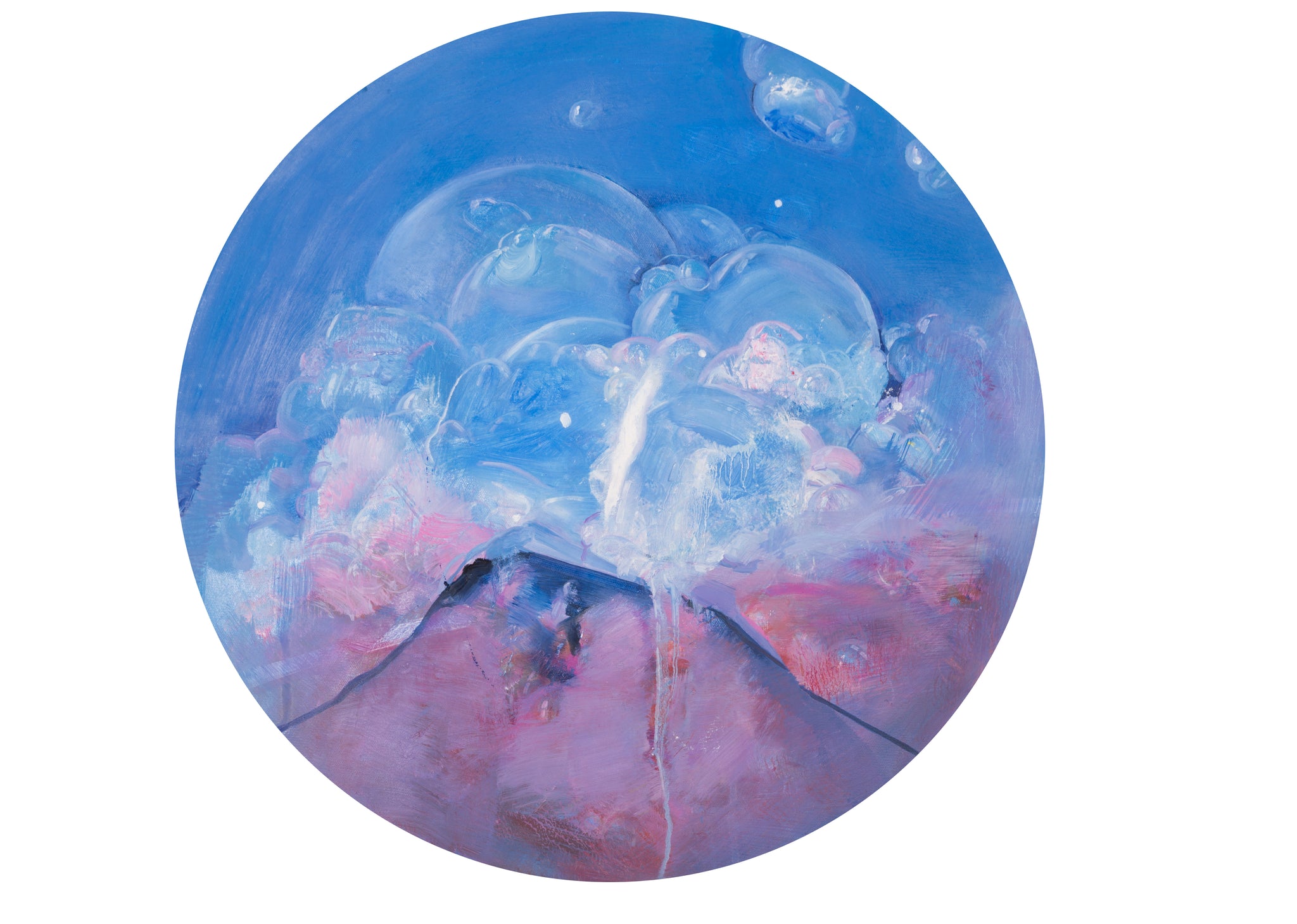 Mystic Waves is a luminous circular oil painting by contemporary artist Yan Yi, created in 2015. The composition features a dreamlike eruption of color and motion, centered on a violet-hued mountain peak releasing diaphanous clouds into a radiant celestial sky. The round format accentuates the cosmic rhythm of the scene, while the palette of purples, pinks, and blues evokes a meditative serenity. The soft blending of oil pigments and cloudlike textures suggest both geological and emotional transformation.