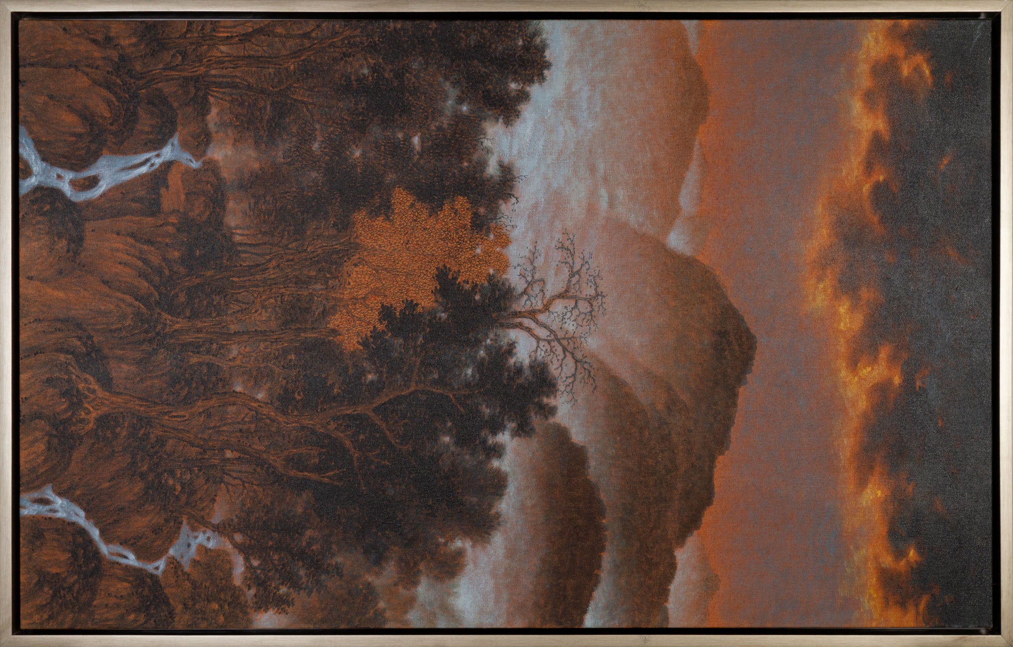 Nan Shan to Rain Diagram is a large-scale acrylic painting by Chinese contemporary artist Huijun Gao. Rendered with extraordinary finesse, the composition presents a layered mountain vista enveloped in a curtain of mist and cascading waterfalls. The palette transitions from dusky blues to glowing ochres, with atmospheric gradations that imbue the landscape with poetic solemnity and depth. Centered in the composition, a bare-branched tree emerges like a sentinel amid the surrounding forest, drawing the viewer into a contemplative engagement with nature.