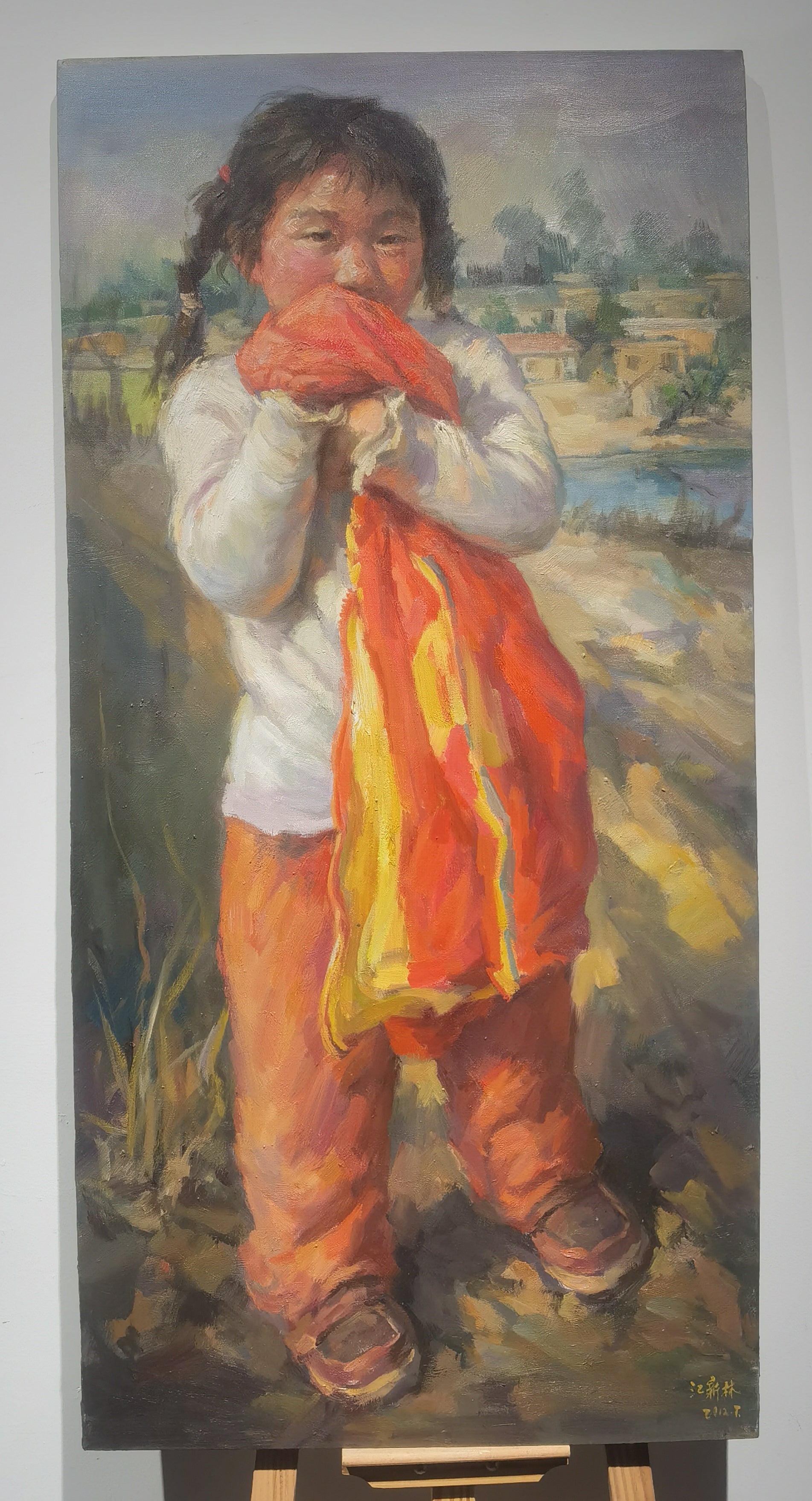 In Girl Who Loves to Laugh, Xinlin Jiang captures a tender and spontaneous moment of childhood joy. This vertical-format oil painting (112.5 × 55 cm / 44.3 × 21.7 in) presents a young girl beaming behind a vibrant red and yellow fabric she playfully holds up to her face. Her bright eyes and impish smile shine through, conveying both innocence and personality. The earthy background and rural village architecture ground the portrait in a specific cultural setting.