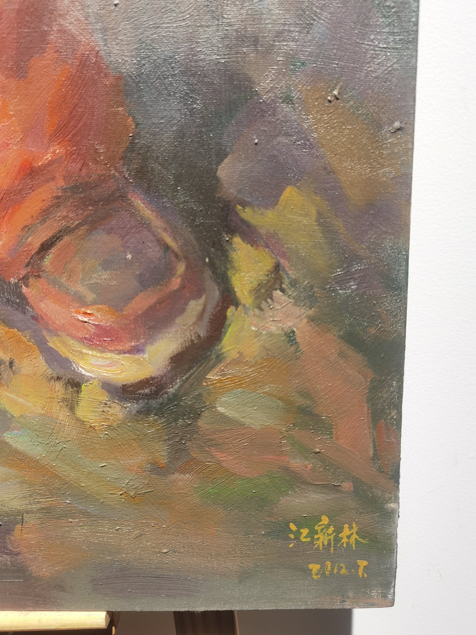 Rendered in Jiang’s distinctive realist technique, the painting echoes the expressive brushwork of post-socialist realism and modern Chinese portraiture. The artist skillfully balances detailed figuration with painterly spontaneity, allowing fabric folds, flushed cheeks, and light to vibrate with life. His influences may be traced to both Chinese academic traditions and Western Impressionist color handling, seen in the lively treatment of texture and tone.
