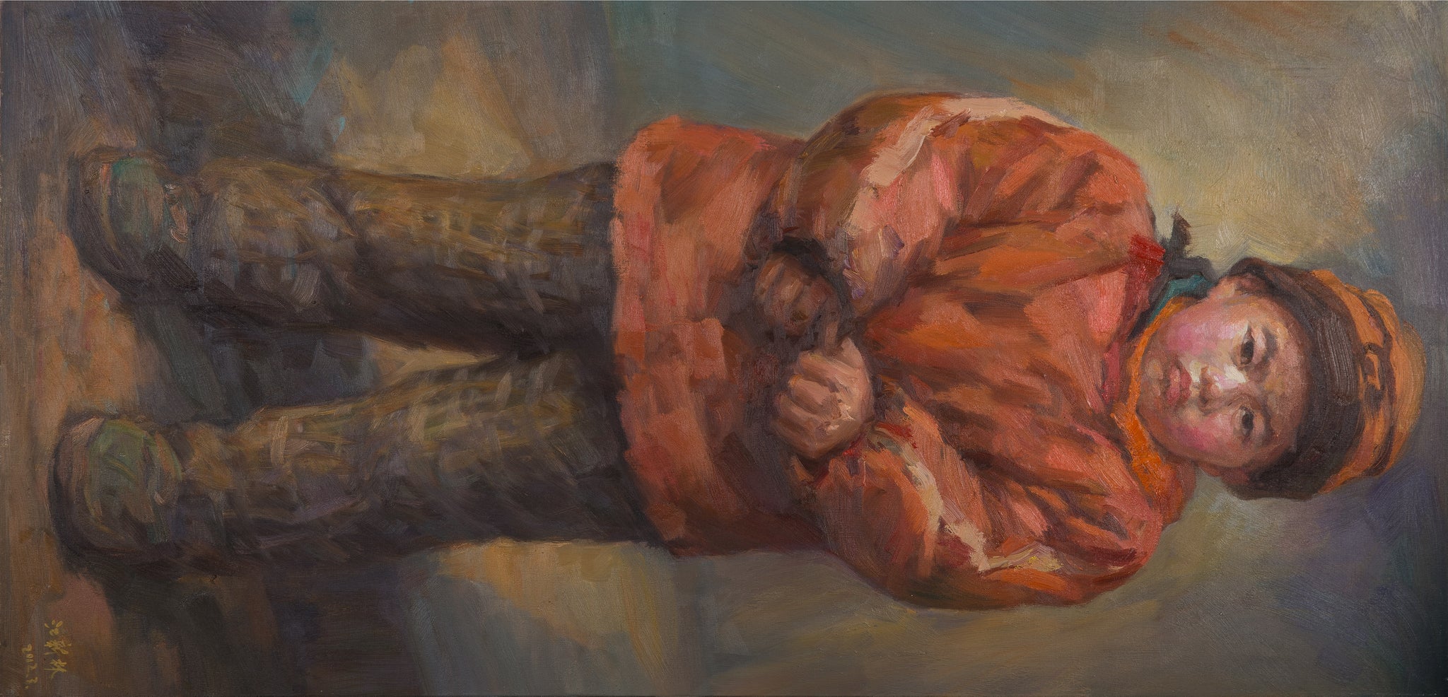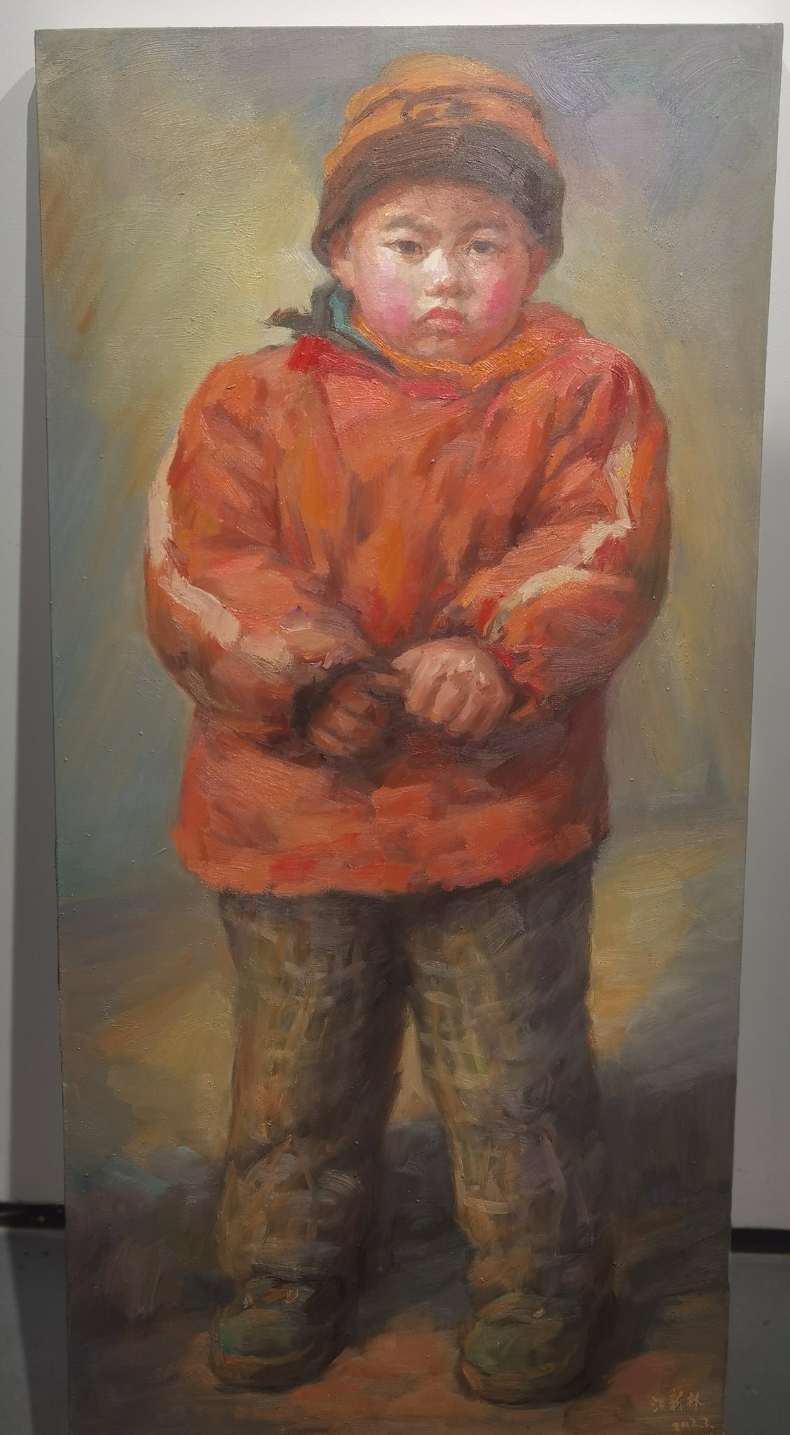 In Strange Look No. 2, Xinlin Jiang offers a tender yet compelling portrayal of a young child standing upright in warm winter clothing. The subject’s direct, unflinching gaze meets the viewer with solemnity and mystery, reinforcing the painting’s Title: and emphasizing a moment of quiet presence. The heavy textures of the oversized orange coat, plaid trousers, and wool cap envelop the child in a protective shell that contrasts with the vulnerability in their eyes.