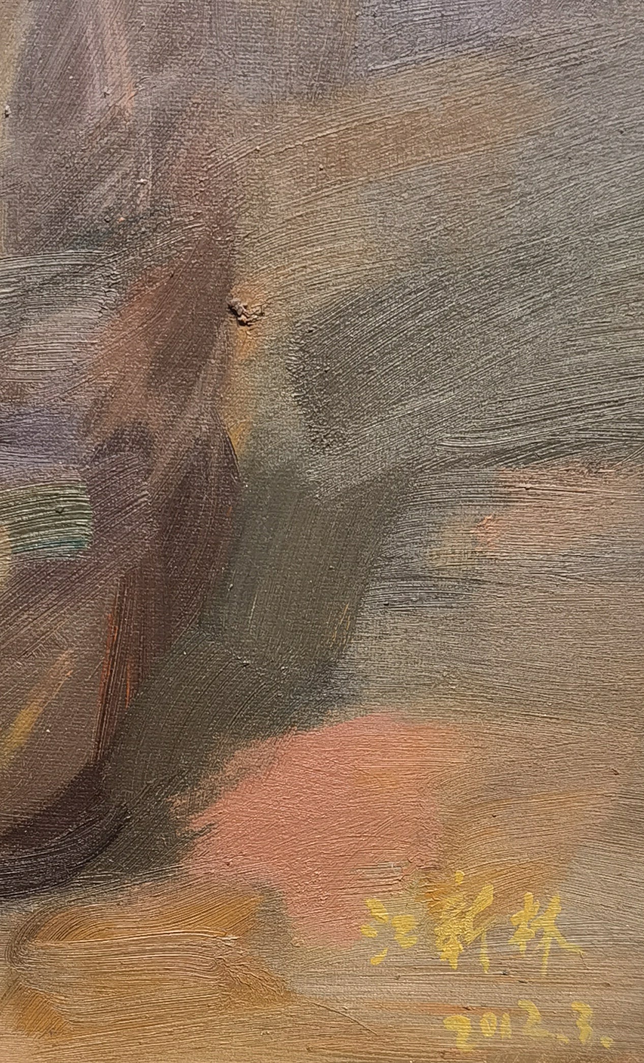 Jiang’s realism blends painterly brushwork with an emphasis on mood and expression. His technique recalls the Chinese rural realist tradition, enriched by a contemporary psychological depth. The background is reduced to gestural abstractions, allowing the figure to emerge with full emotional force while surrounded by an atmosphere of still ambiguity.