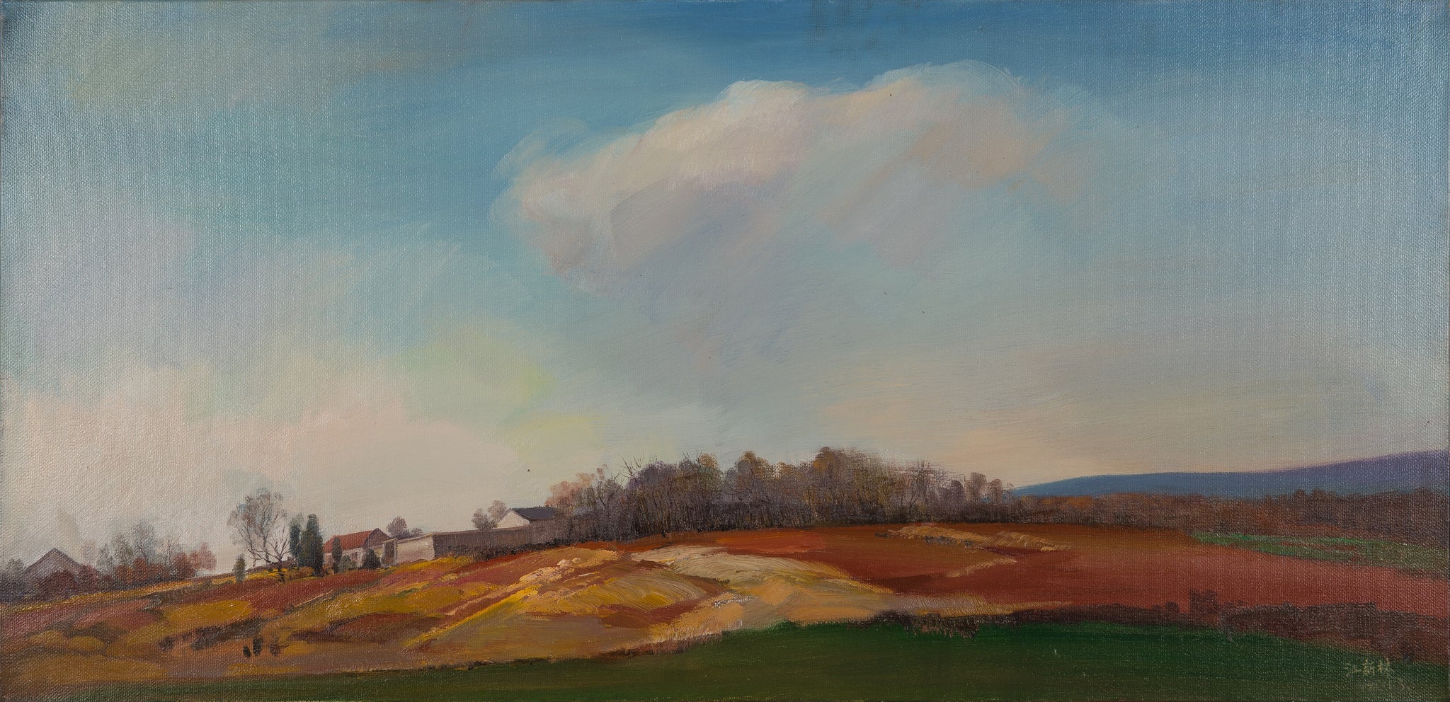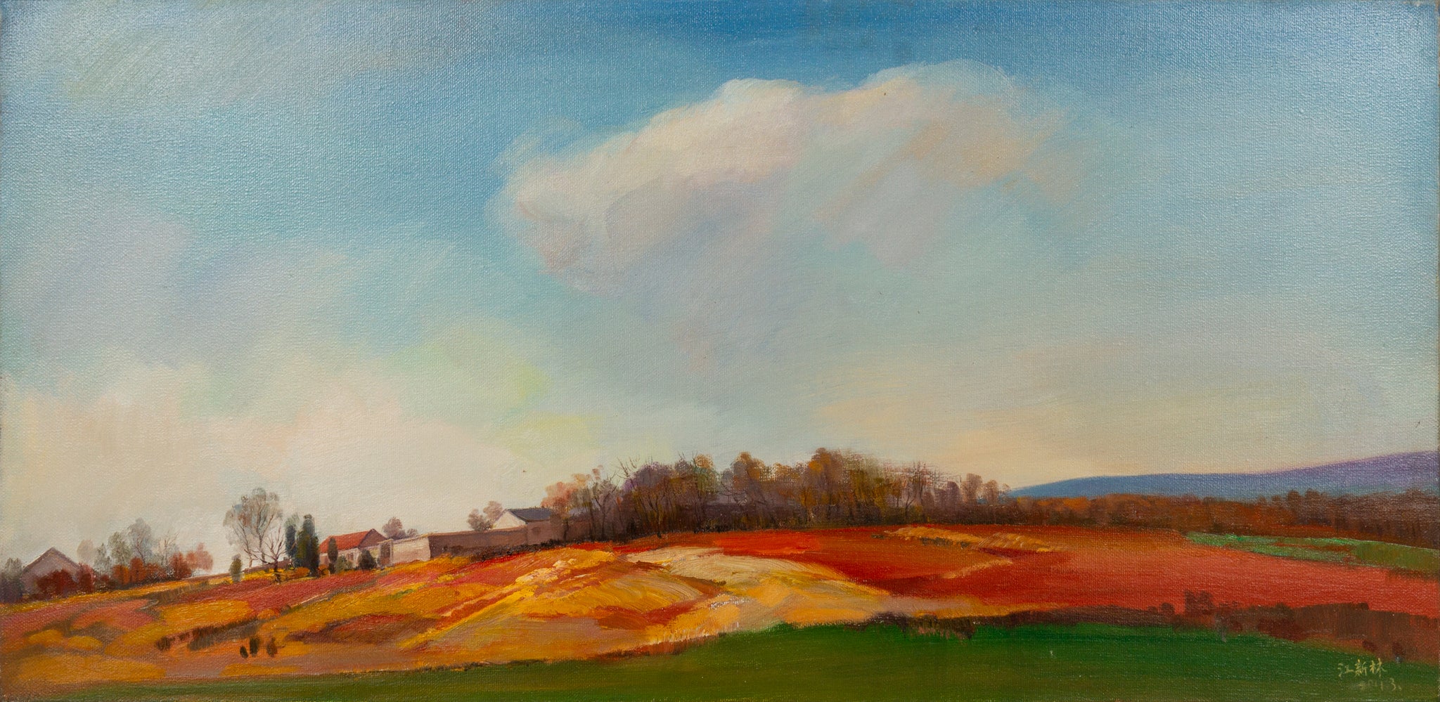 On the Slope II is a serene and expansive landscape by Xinlin Jiang that captures a peaceful moment in the countryside. The composition stretches across a low horizon, with earthen slopes in soft ochres, reds, and greens that guide the eye toward a quiet village at the edge of a tree line. Above, a wide sky dominates the canvas, crowned by a single voluminous cloud, evoking calm and openness.