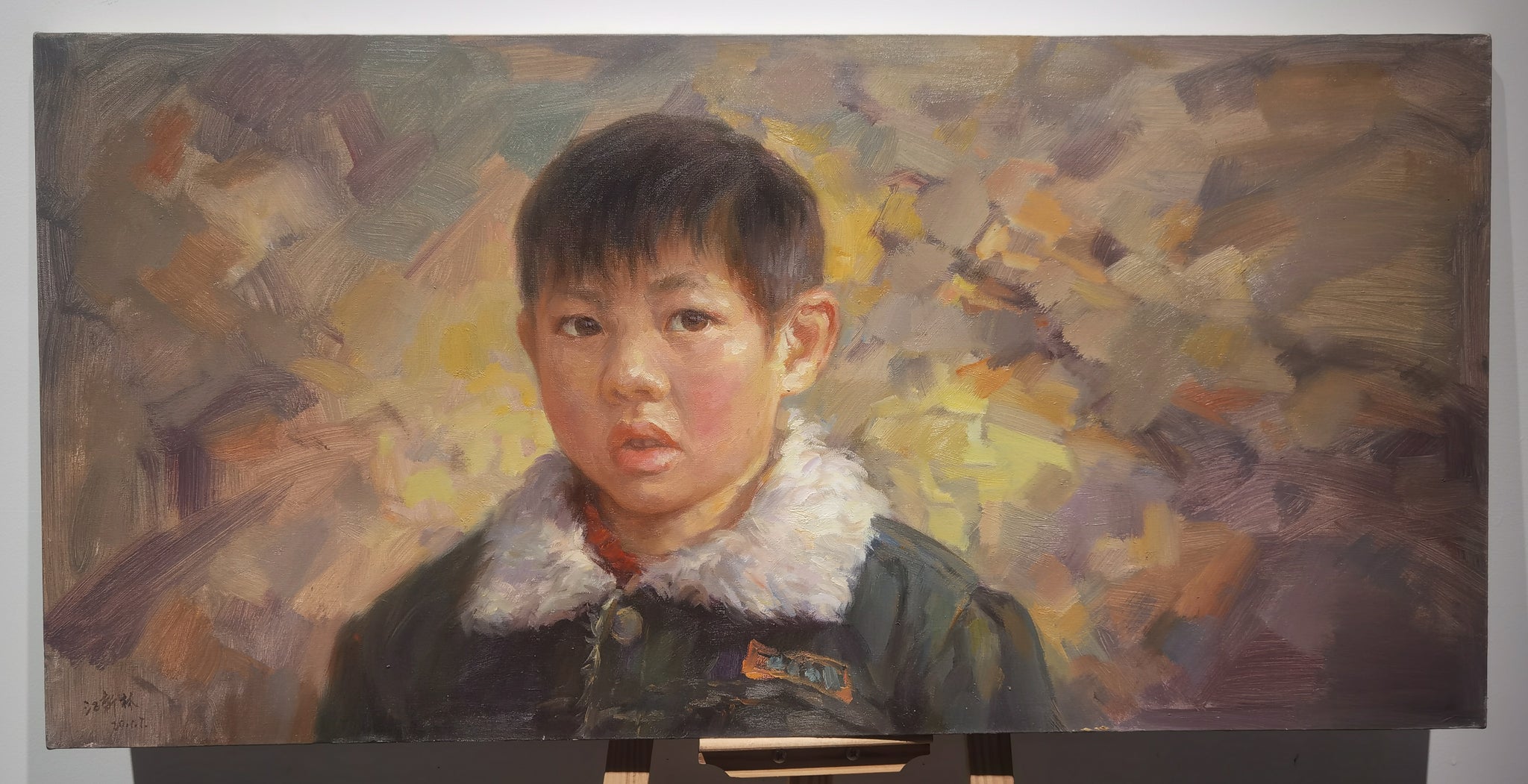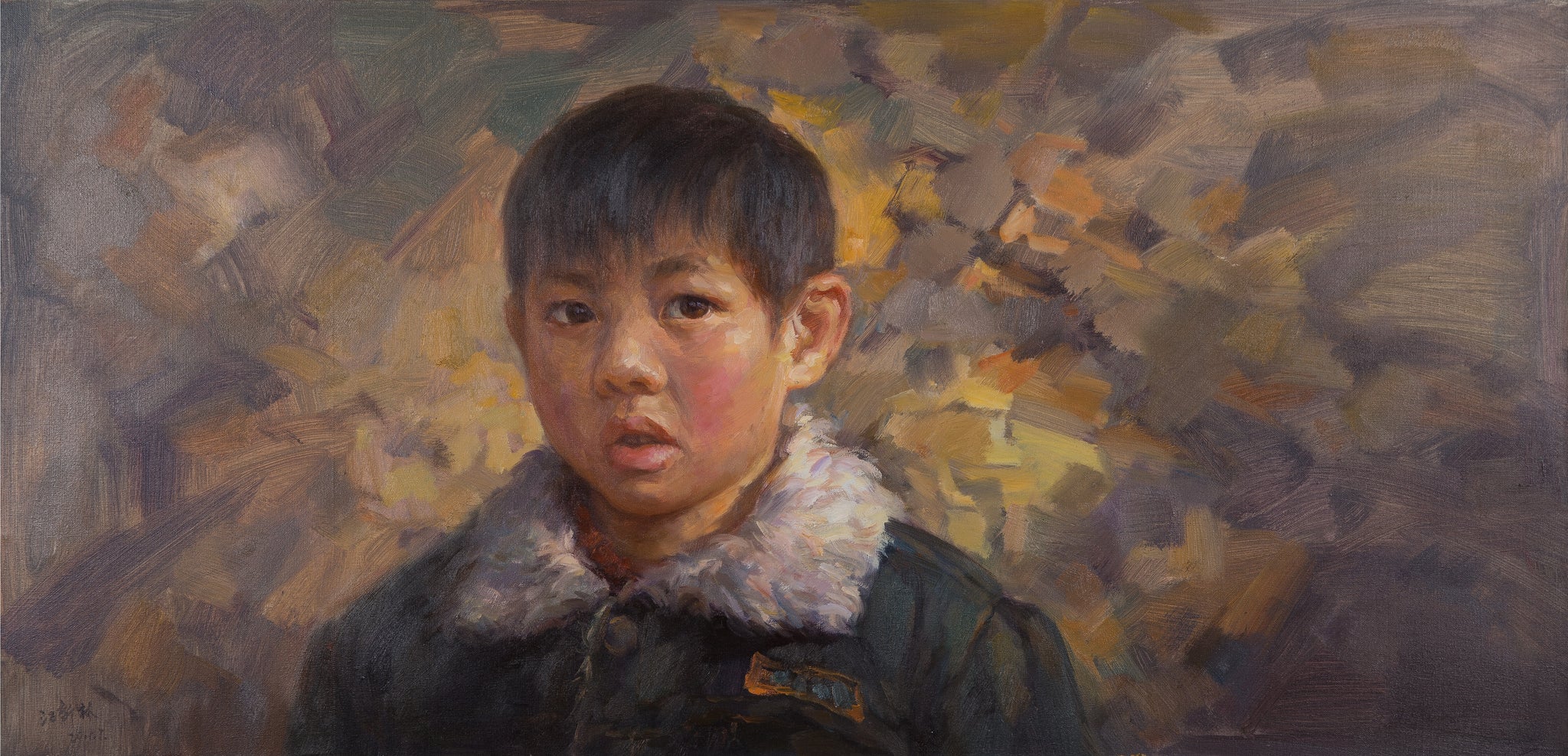 Rendered in the artist’s signature realist style, this painting combines precise portraiture with looser, expressive brushwork in the background. The contrast between the boy’s sharply defined features and the abstracted backdrop creates a psychological tension that mirrors the emotional state of the subject. Jiang’s technique shows the influence of Chinese academic realism infused with a sensitivity to mood and atmosphere.