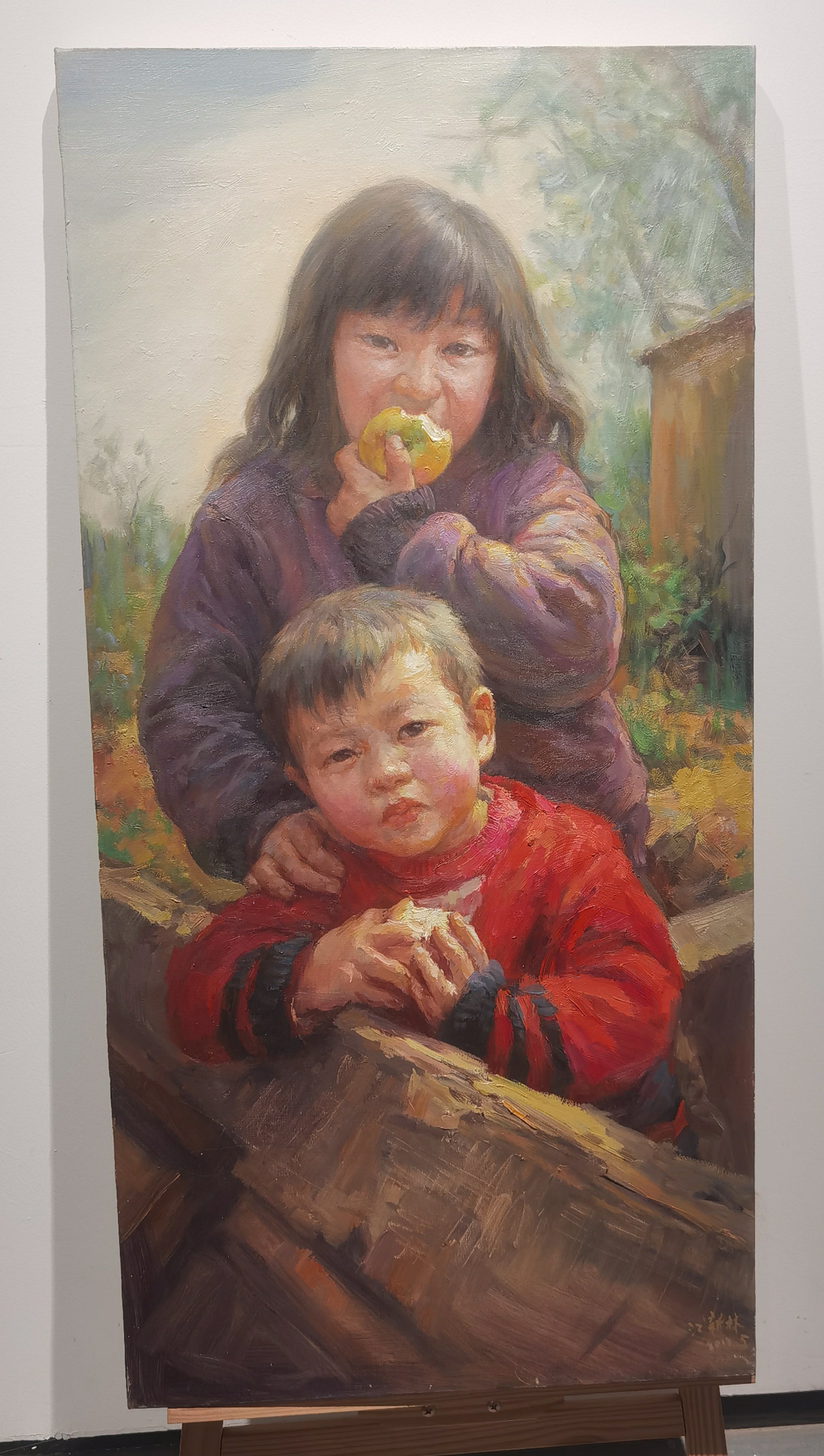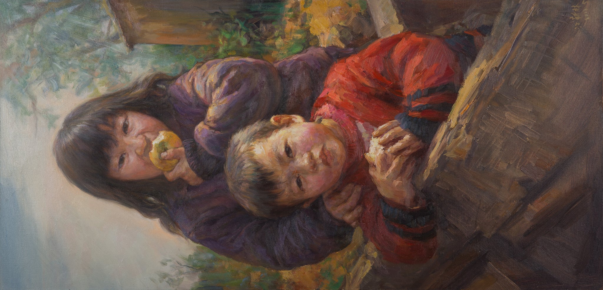 In Apples to Share, Xinlin Jiang presents a tender portrait of two young children—an older girl gently holding a younger boy while enjoying a green apple. The painting radiates familial affection and rural simplicity, capturing an unposed moment filled with quiet intimacy and care.