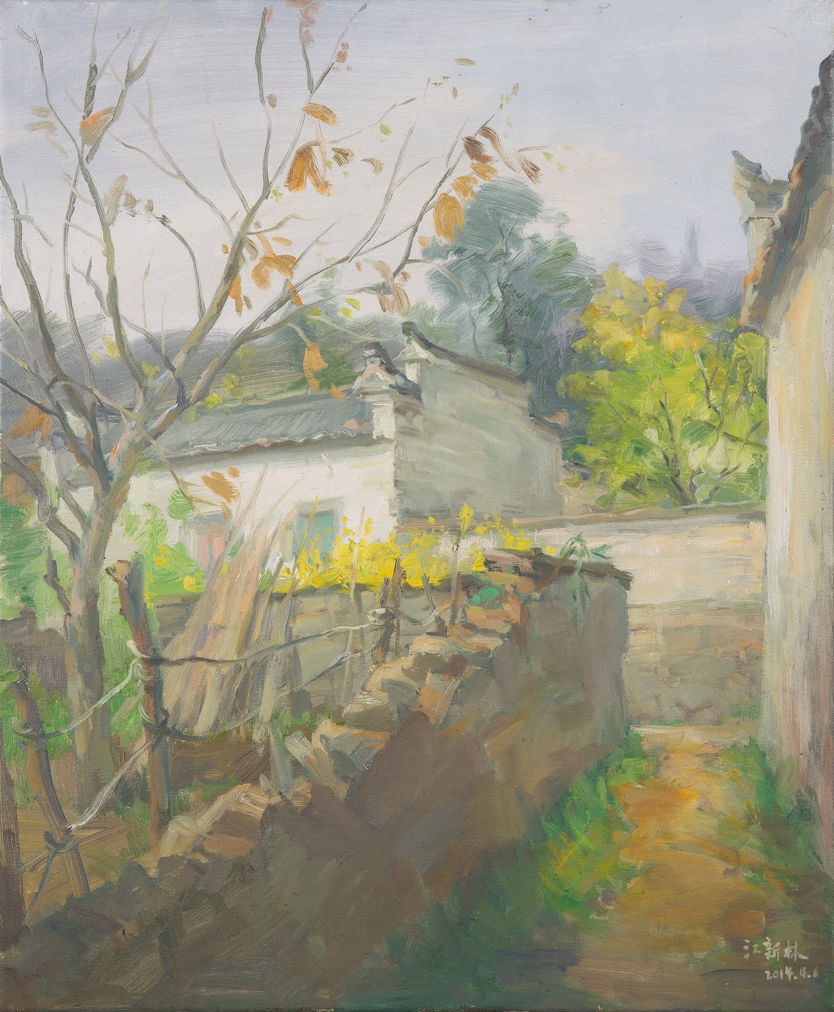 Executed in a painterly realist manner with impressionistic undertones, Jiang’s brushwork exhibits spontaneity and lyrical warmth. The influence of European plein air techniques is evident in the handling of light and shadow, yet the sensibility remains rooted in Chinese aesthetics—particularly in the careful attention to seasonal atmosphere and the harmony between architecture and landscape. Jiang’s sensitivity to temporal cycles is echoed in the falling leaves and quiet decay.