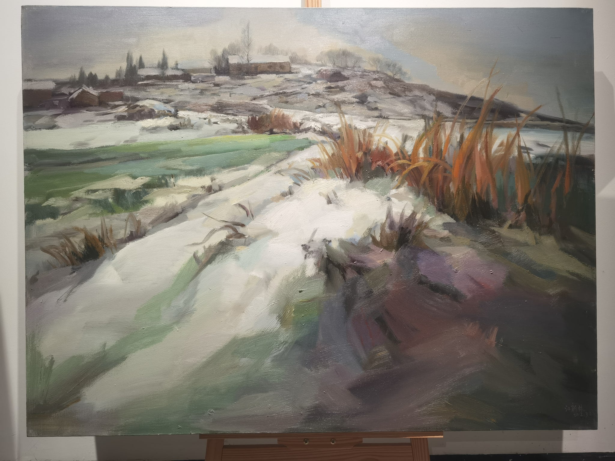 The painting showcases Jiang’s signature blend of expressive brushwork and tonal realism. The loose but deliberate strokes lend energy to the snow-covered foreground, while the juxtaposition of warm ochres and cool greens animates the scene. Influenced by both traditional Chinese landscape aesthetics and European plein air techniques, Jiang captures the subtleties of seasonal change with poetic restraint.