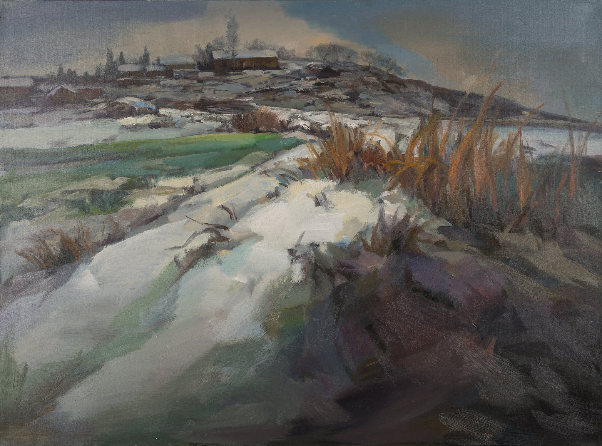 Executed in 2012, The View on the Ridge is a landscape painting by Xinlin Jiang, rendered in oil on canvas. The composition depicts a gently sloping ridge partially cloaked in snow, with vibrant tufts of dry grass piercing through the frozen terrain. A distant village crowns the horizon beneath a vast, turbulent sky.