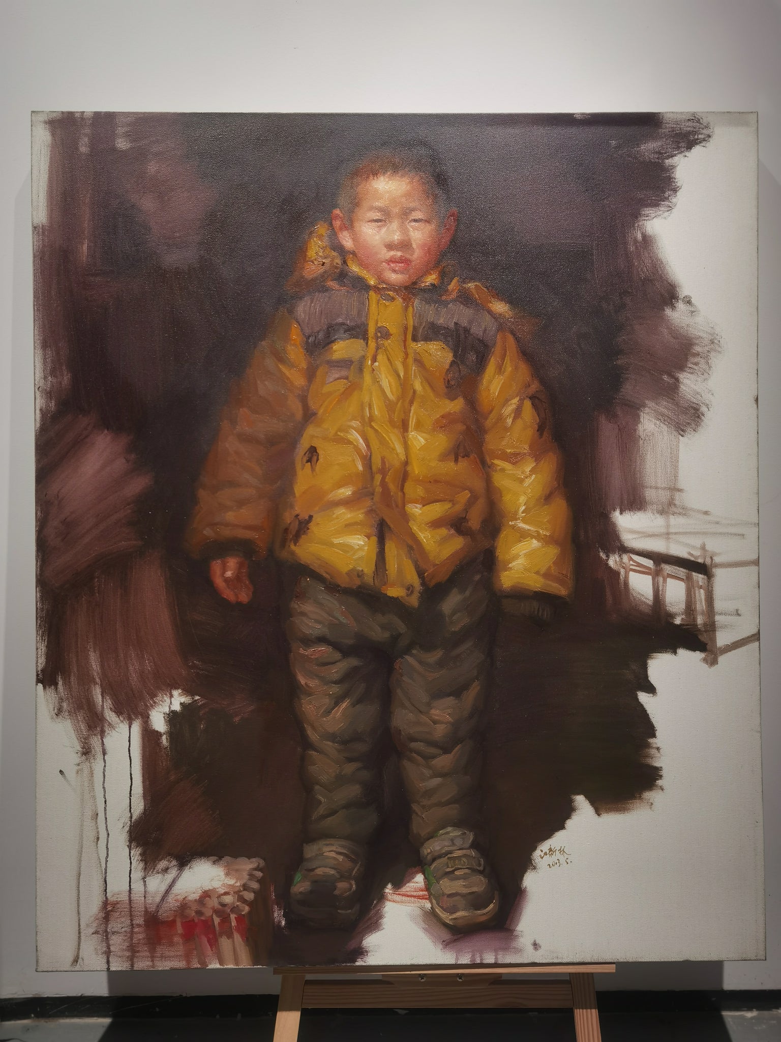 This piece blends realism with painterly spontaneity, a hallmark of Jiang's evolving style. The attention to texture, particularly in the jacket and facial expression, demonstrates his technical skill, while the raw, unfinished elements suggest modernist influences. The use of light and shadow highlights the boy’s presence, embodying themes of resilience and identity.