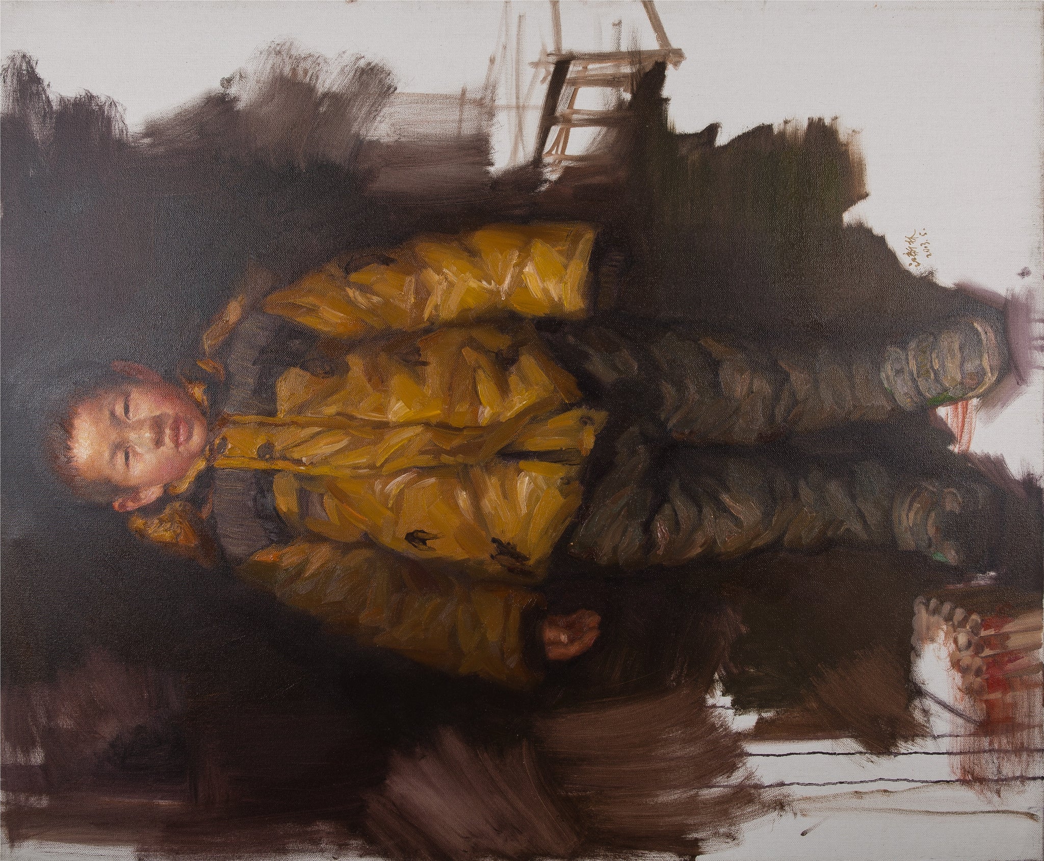 Teenager in the Sun is a powerful portrait by Xinlin Jiang, painted in 2013. The work features a solitary boy standing confidently in a bright yellow winter coat, his figure emerging vividly from an unfinished and expressive background. The composition juxtaposes careful figuration with loose, gestural brushwork, offering a compelling sense of immediacy and emotional contrast.