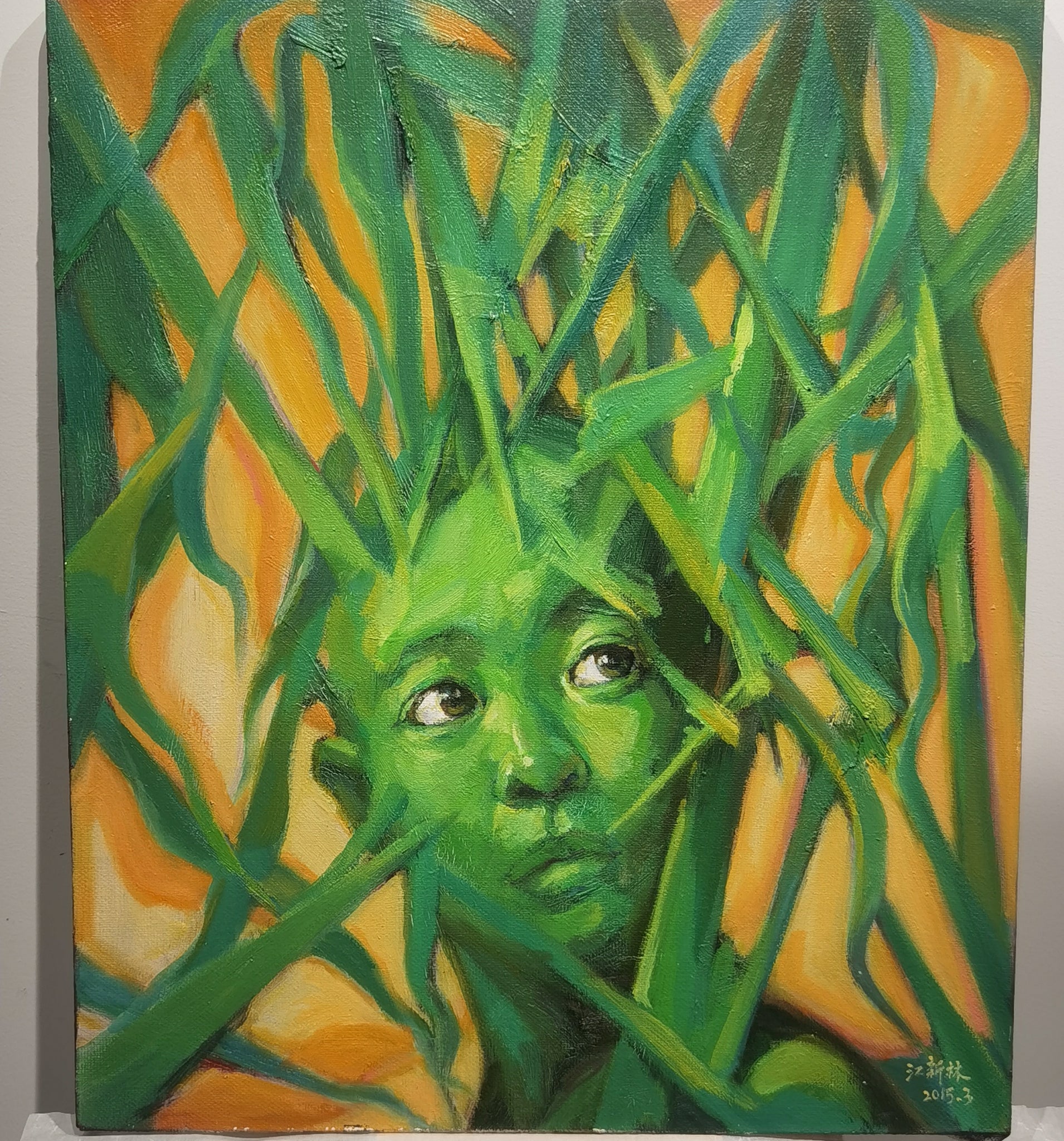 Portrait 3 by Xinlin Jiang is a vivid oil on canvas composition featuring a stylized green-toned face peering pensively through an enveloping mass of leaf-like strands. The portrait measures 60 x 50 cm and draws immediate attention through its bold chromatic choices—particularly the contrast between the verdant figure and a luminous, ochre-orange background. The subject’s wide eyes lend the piece a quietly dramatic narrative, blending introspection with surreal whimsy.
